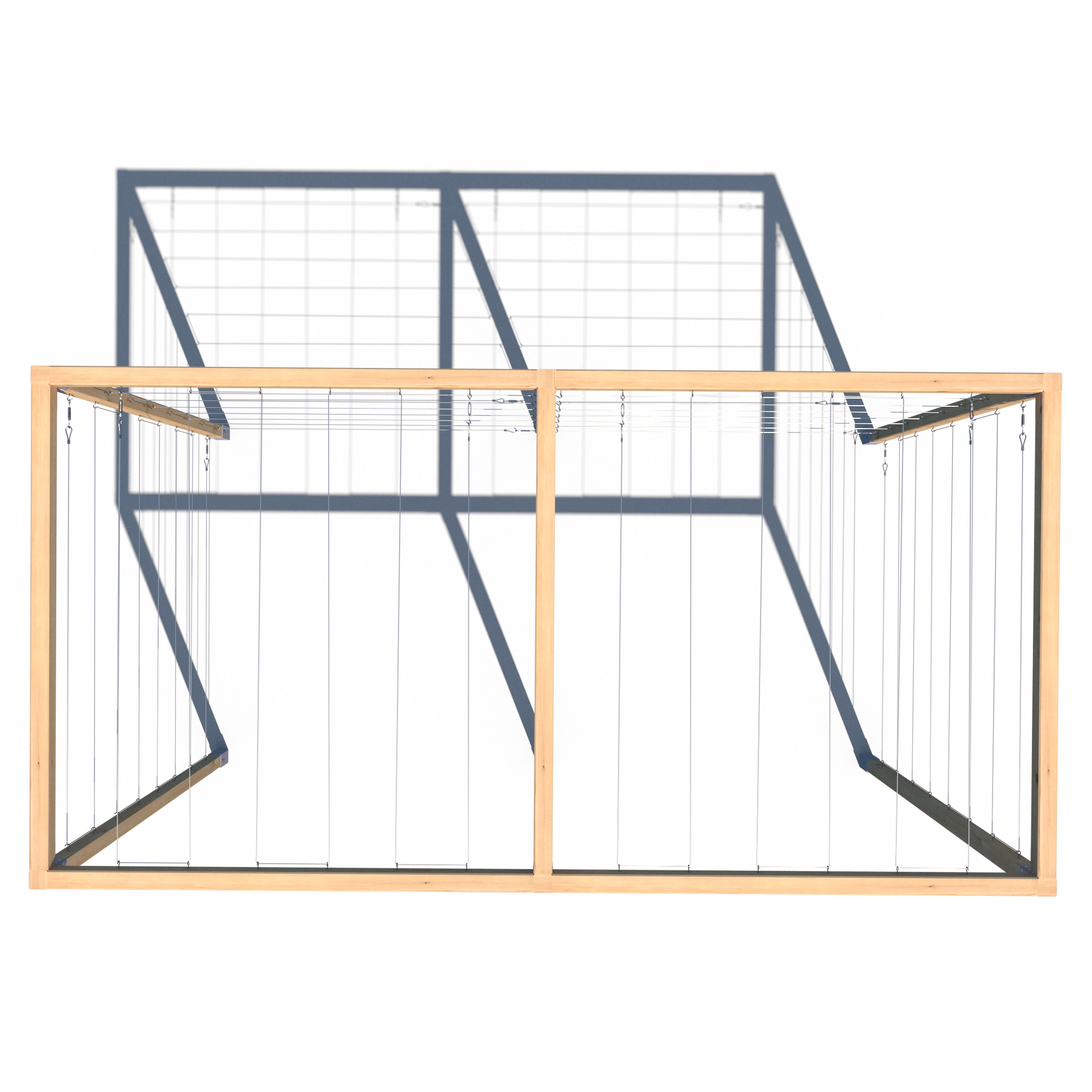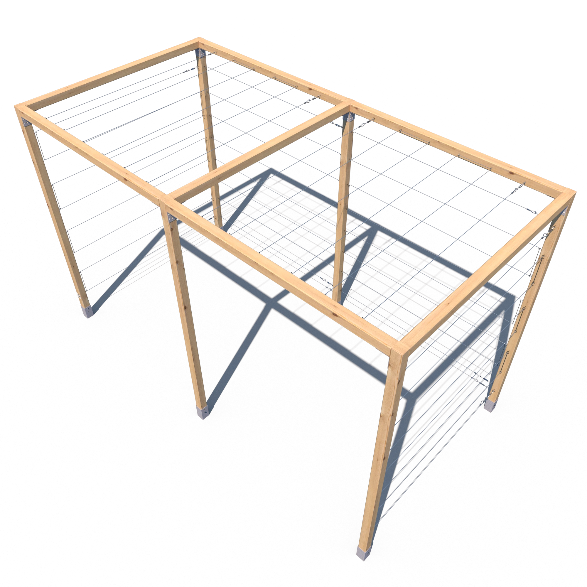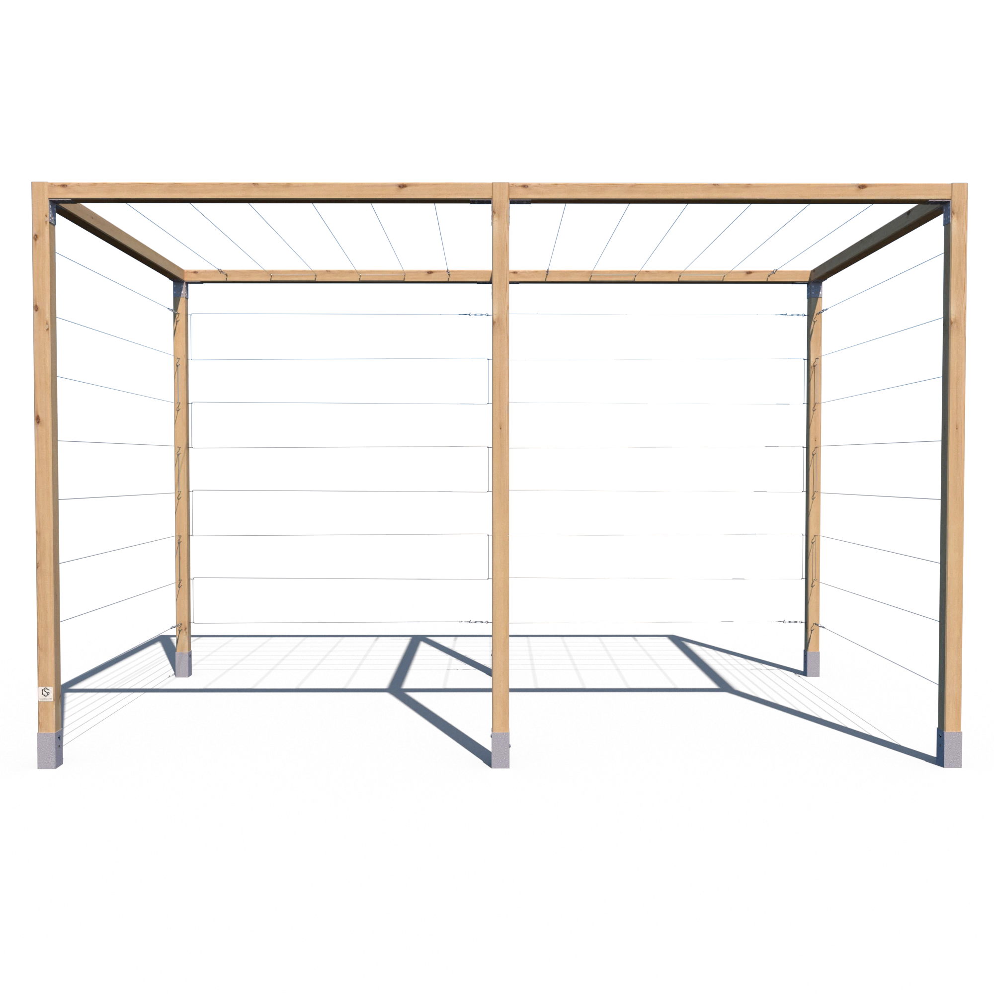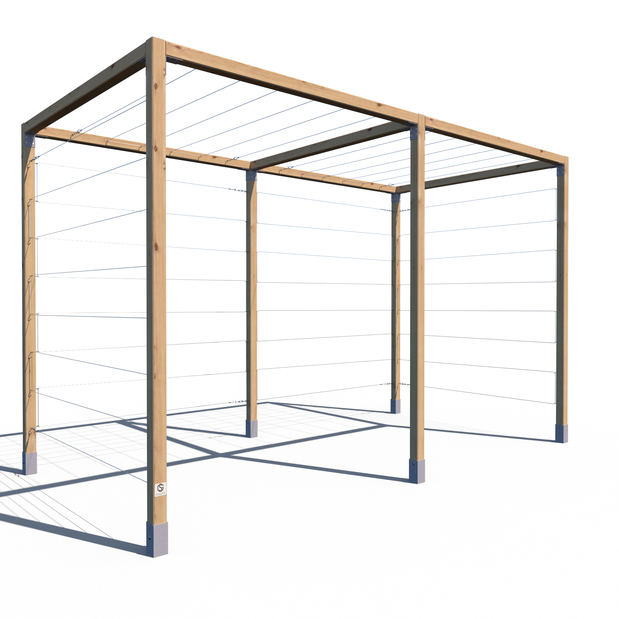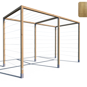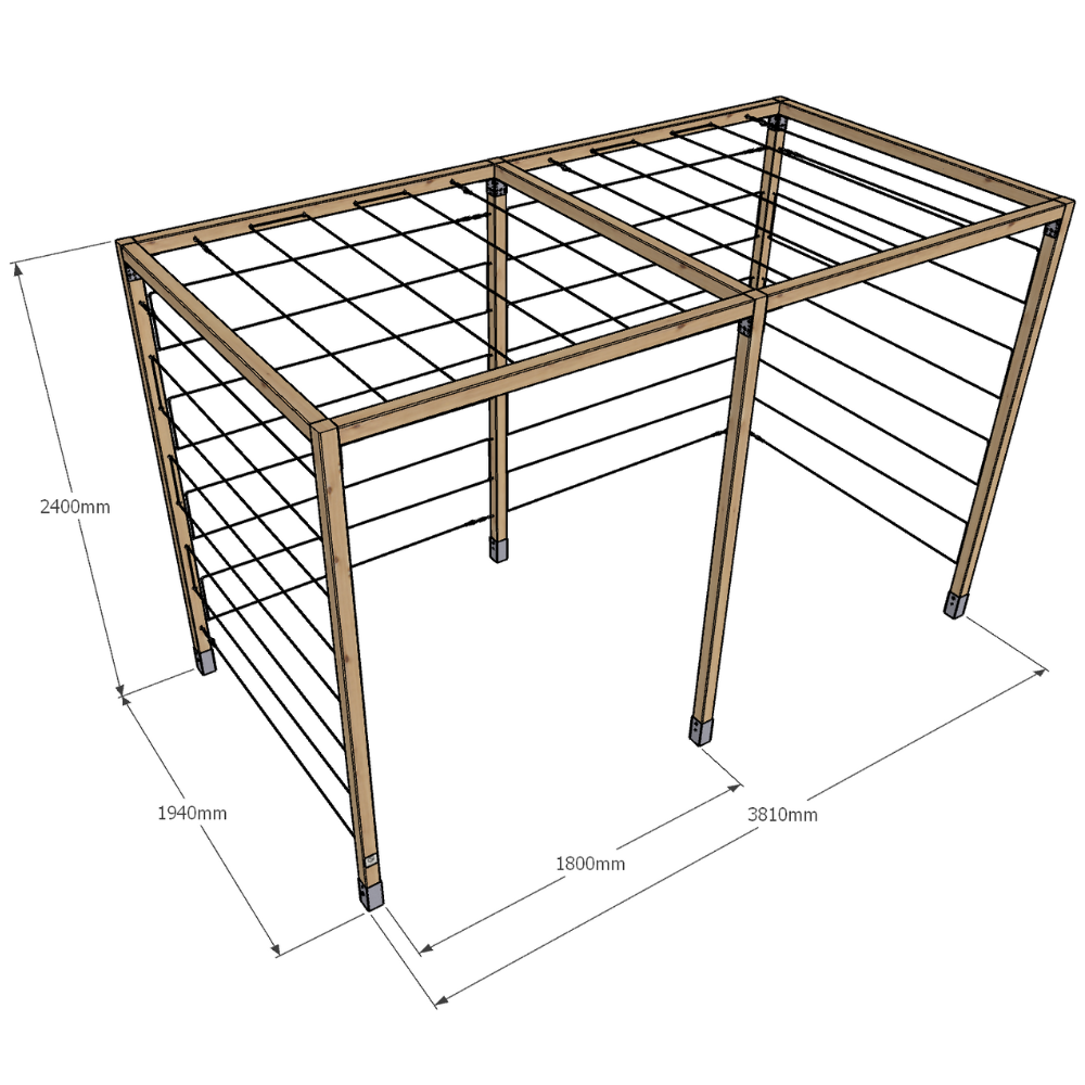Model K 240x194x381 to rozbudowana wersja klasycznej pergoli serii K – składająca się z dwóch połączonych segmentów. Konstrukcja opiera się na aż sześciu pionowych kantówkach 70x70 mm oraz siedmiu belkach górnych, co zapewnia wyjątkową stabilność i trwałość. Przeznaczona do aranżacji dużych przestrzeni ogrodowych, stref wejściowych, przestrzeni przy ogrodzeniach lub jako baza pod rośliny pnące. Standardowo wyposażona w stalowe cięgna – zarówno na trzech ścianach bocznych, jak i na dwóch górnych sekcjach.