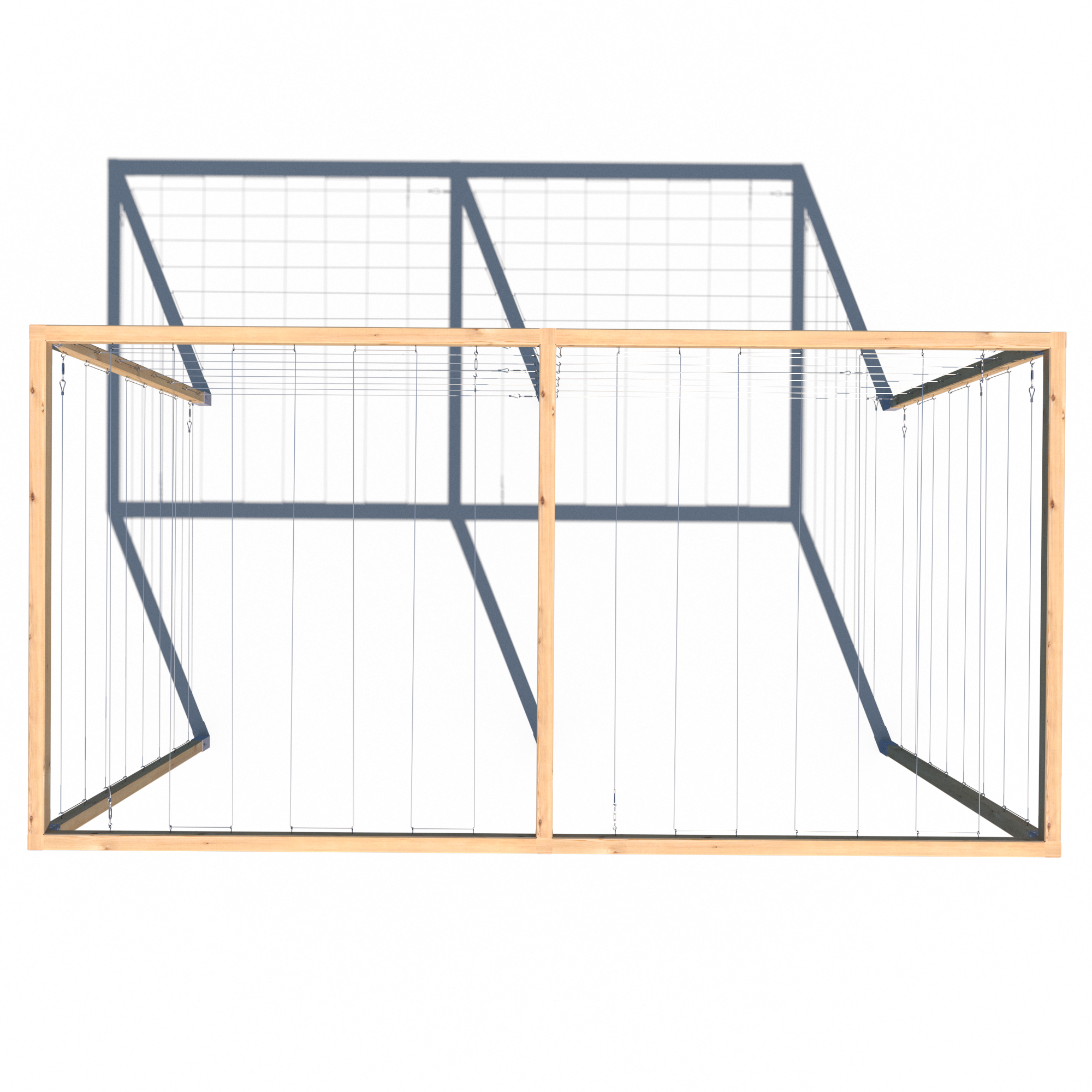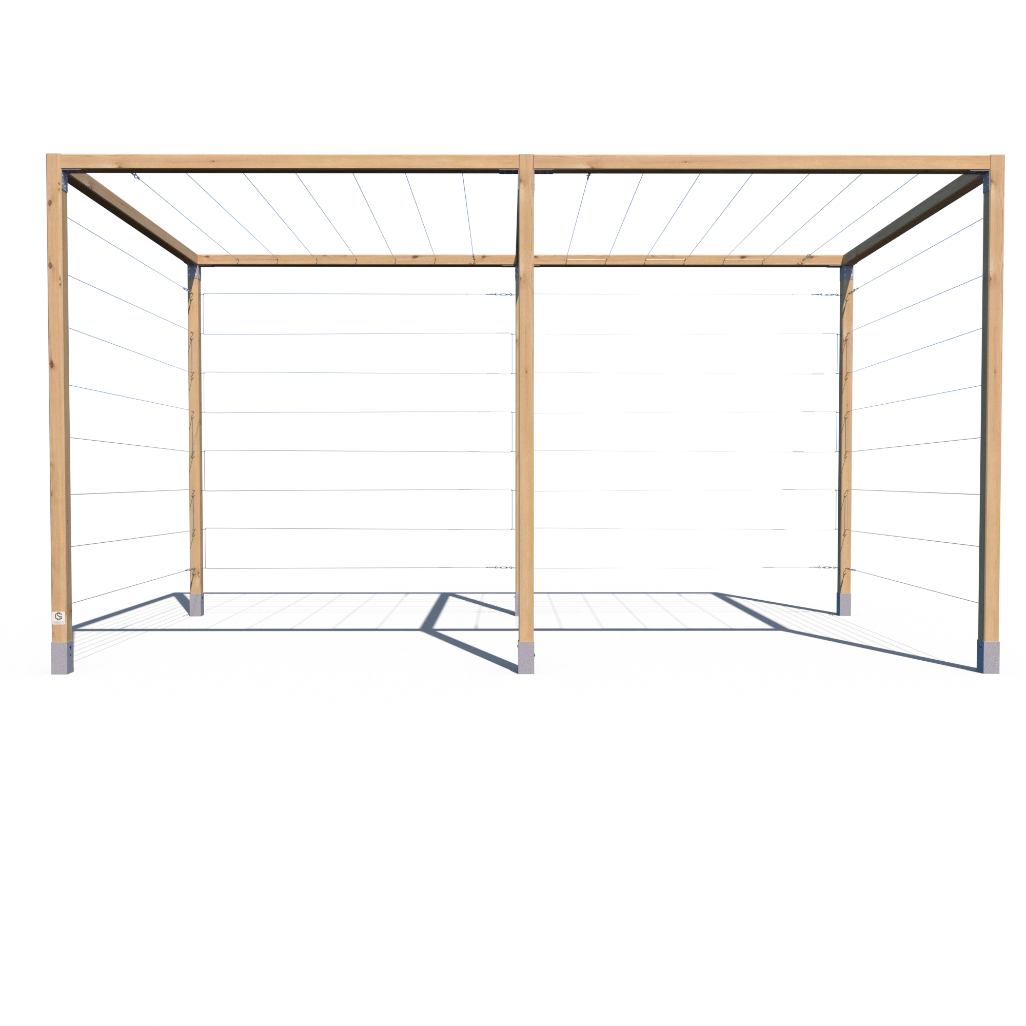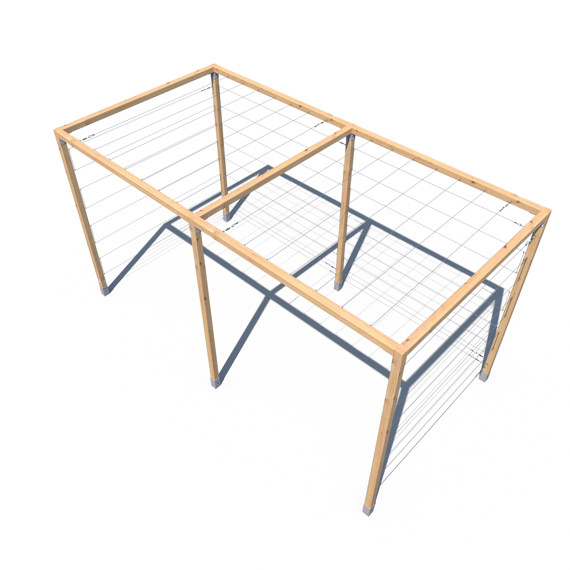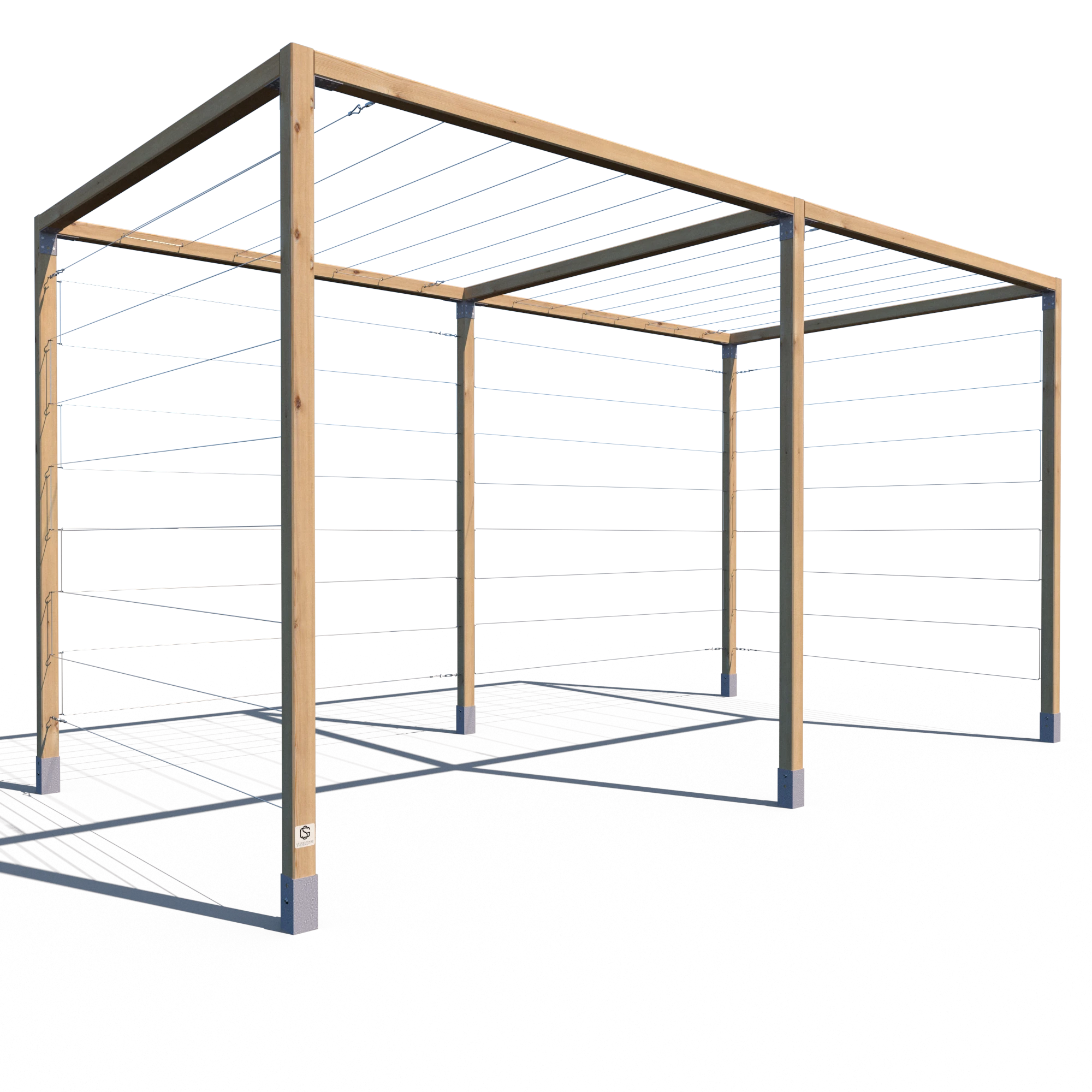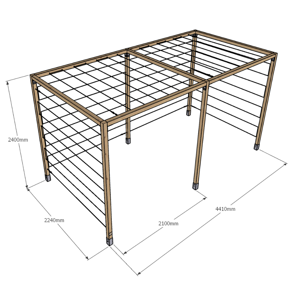 Model K 240x224x441 to rozbudowana wersja klasycznej pergoli serii K – składająca się z dwóch połączonych segmentów. Konstrukcja opiera się na aż sześciu pionowych kantówkach 70x70 mm oraz siedmiu belkach górnych, co zapewnia wyjątkową stabilność i trwałość. Przeznaczona do aranżacji dużych przestrzeni ogrodowych, stref wejściowych, przestrzeni przy ogrodzeniach lub jako baza pod rośliny pnące. Standardowo wyposażona w stalowe cięgna – zarówno na trzech ścianach bocznych, jak i na dwóch górnych sekcjach.