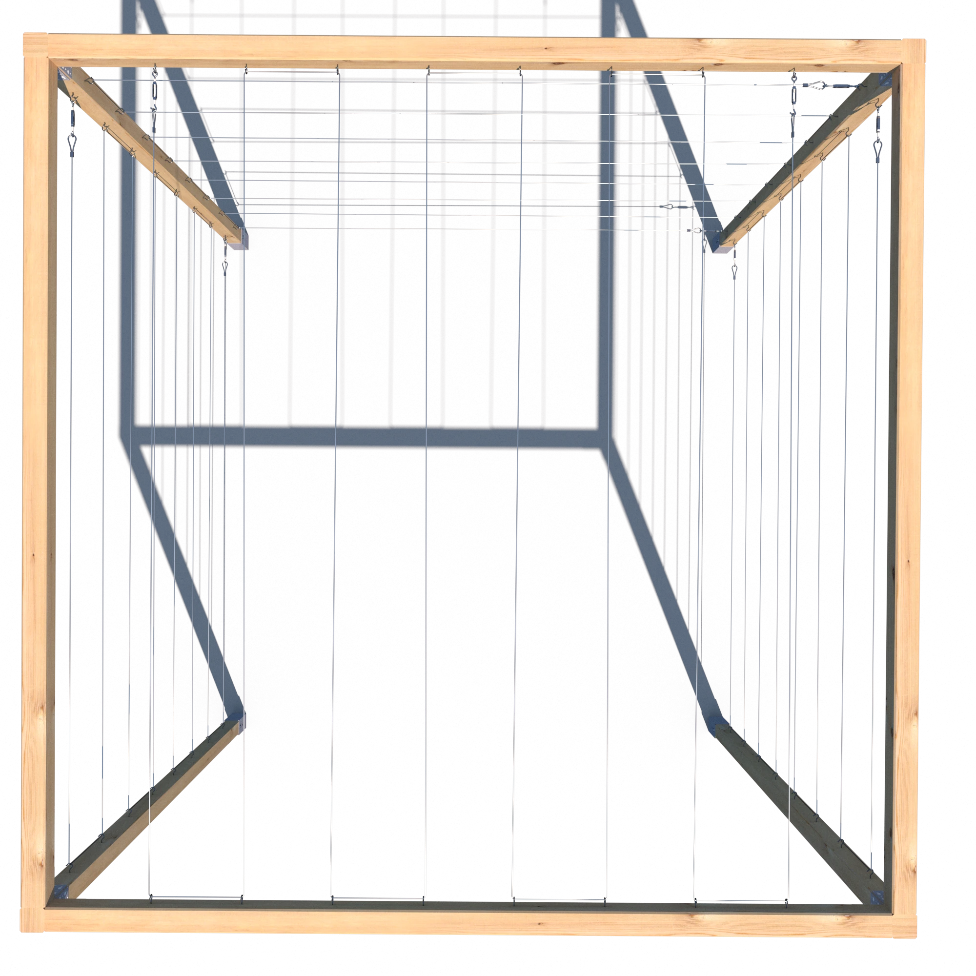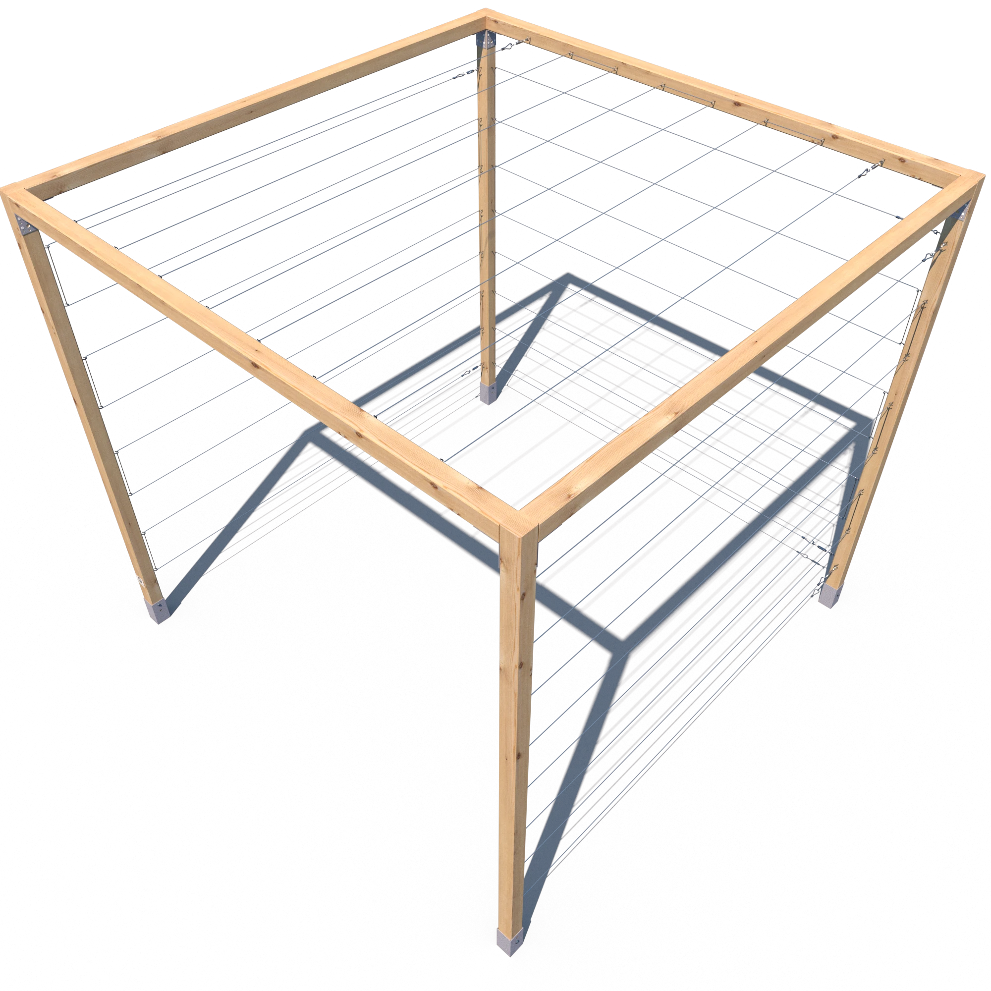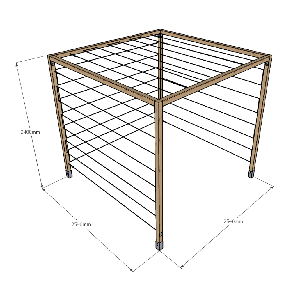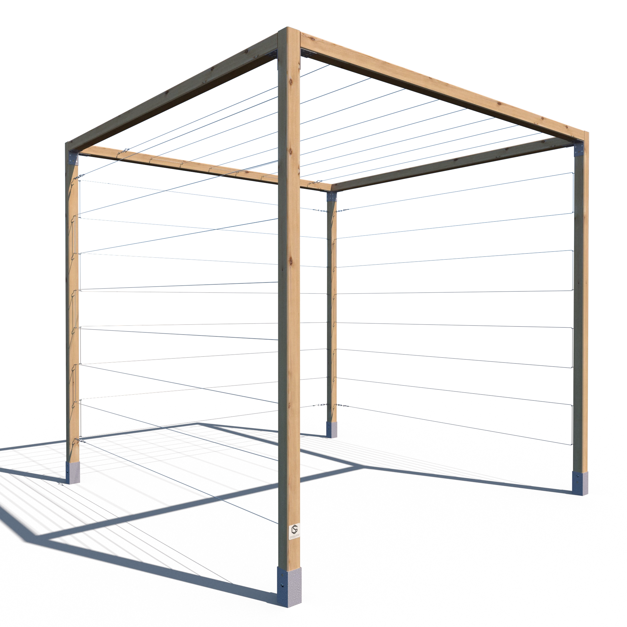 Pergola K 240x254x254 to przestrzenna, solidna konstrukcja drewniana do ogrodu lub tarasu, oparta na czterech grubych kantówkach i czterech poziomych belkach. Wyposażona w system linek stalowych na trzech bokach oraz górnej powierzchni, umożliwia prowadzenie wielu gatunków pnączy. Wersja impregnowana ciśnieniowo na kolor ciemny dąb nadaje eleganckiego i naturalnego charakteru przestrzeni.