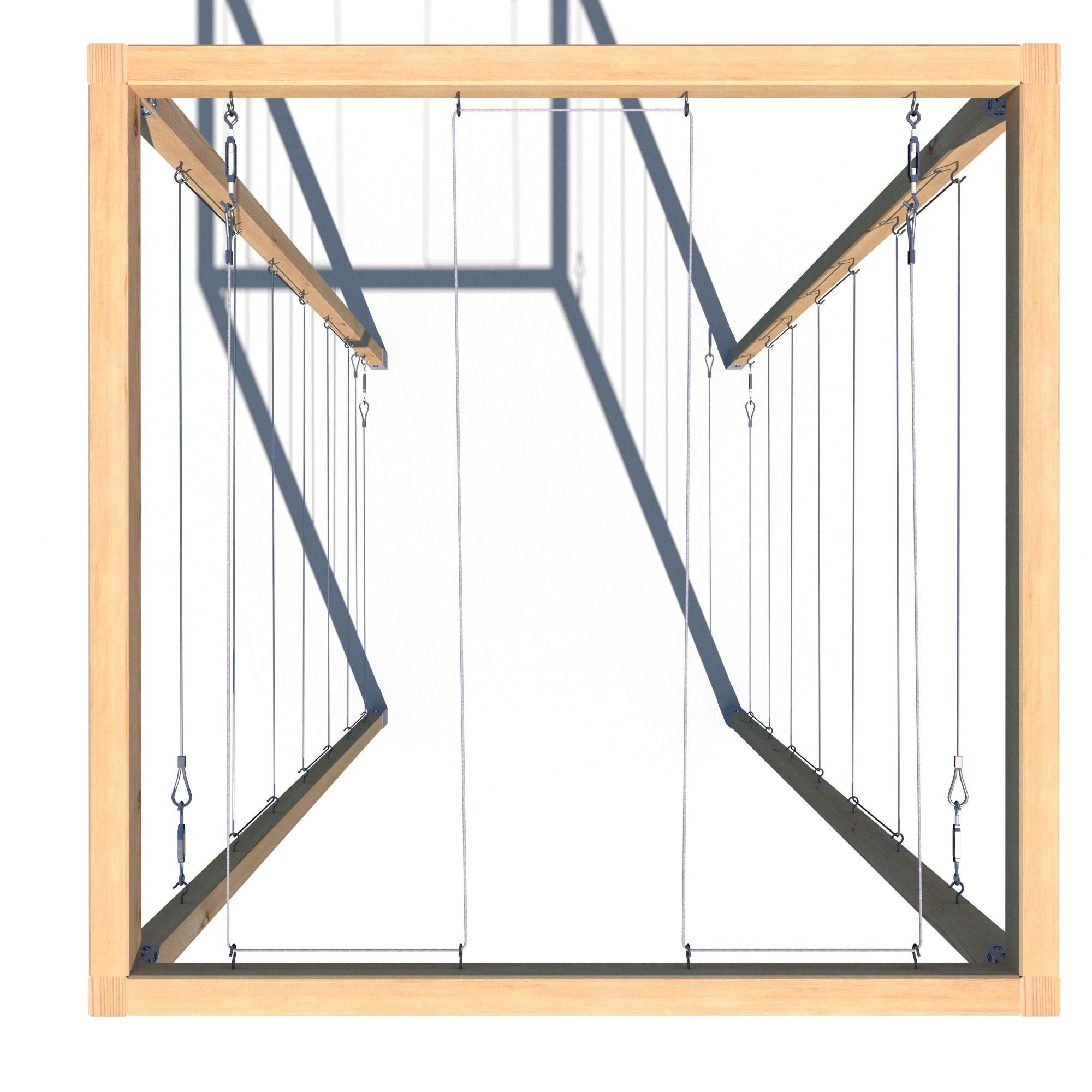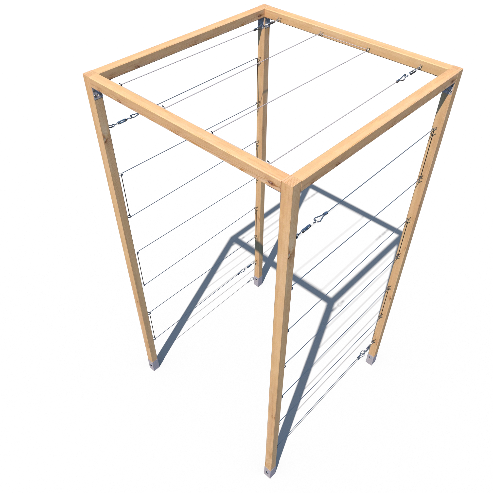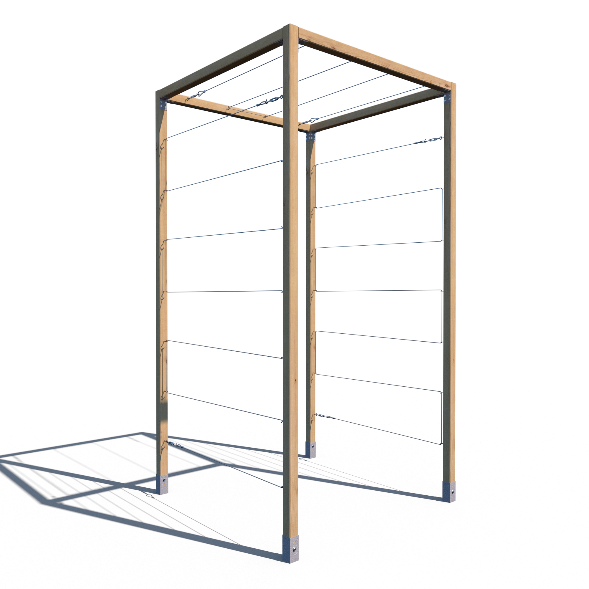 Model K Mini 210x109x109 to propozycja dla osób szukających kompaktowej pergoli do małych ogrodów, tarasów lub balkonów. Pergola posiada cztery pionowe kantówki oraz cztery górne belki, tworząc stabilną ramę do montażu stalowych linek. Linki rozmieszczone są poziomo – 7 na bokach oraz 4 na górze konstrukcji. Dzięki klasycznej formie i eleganckiemu wykończeniu w kolorze ciemny dąb doskonale komponuje się z otoczeniem.