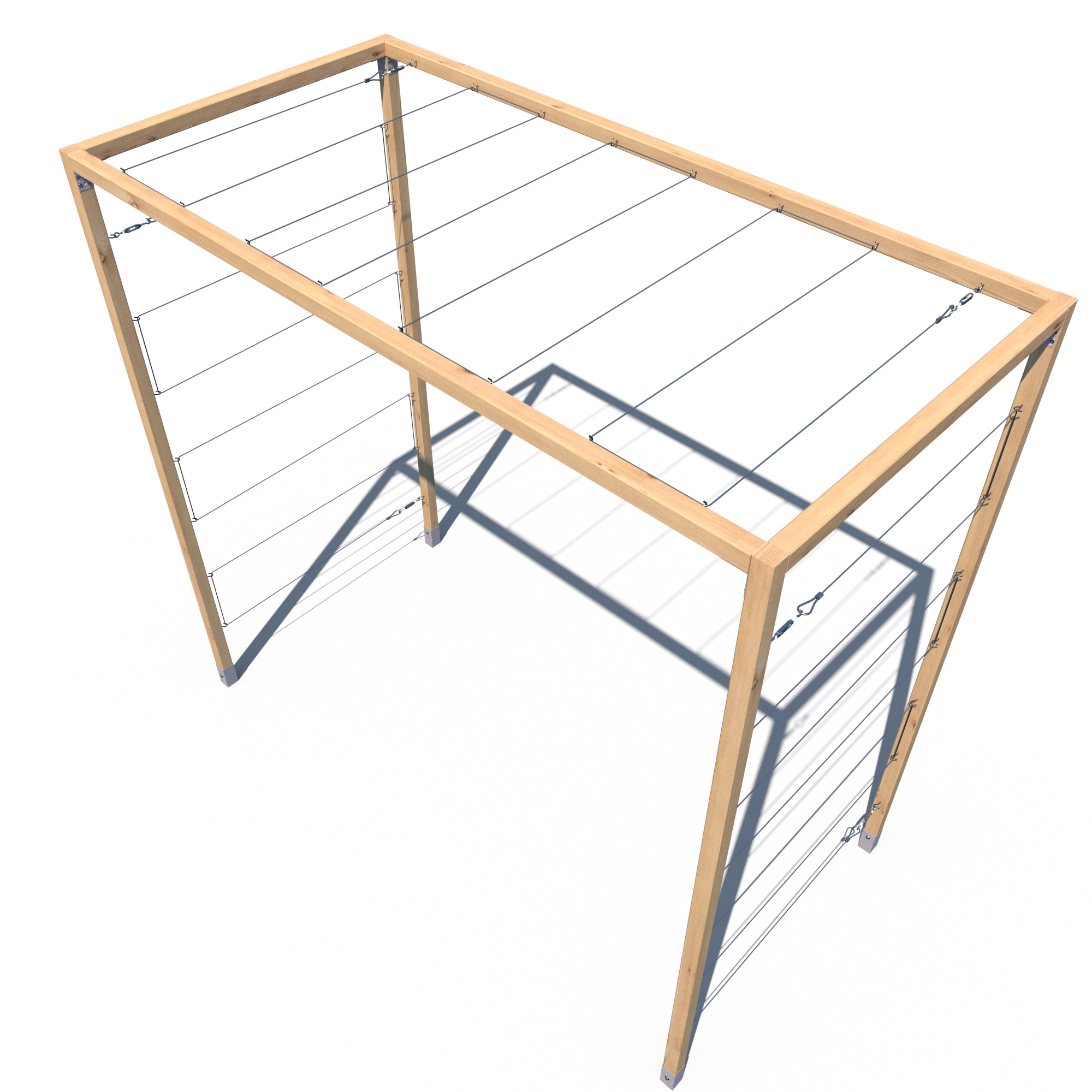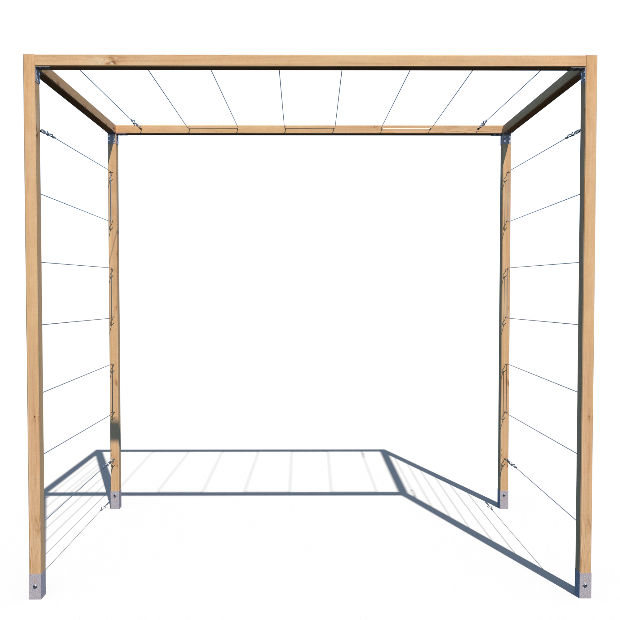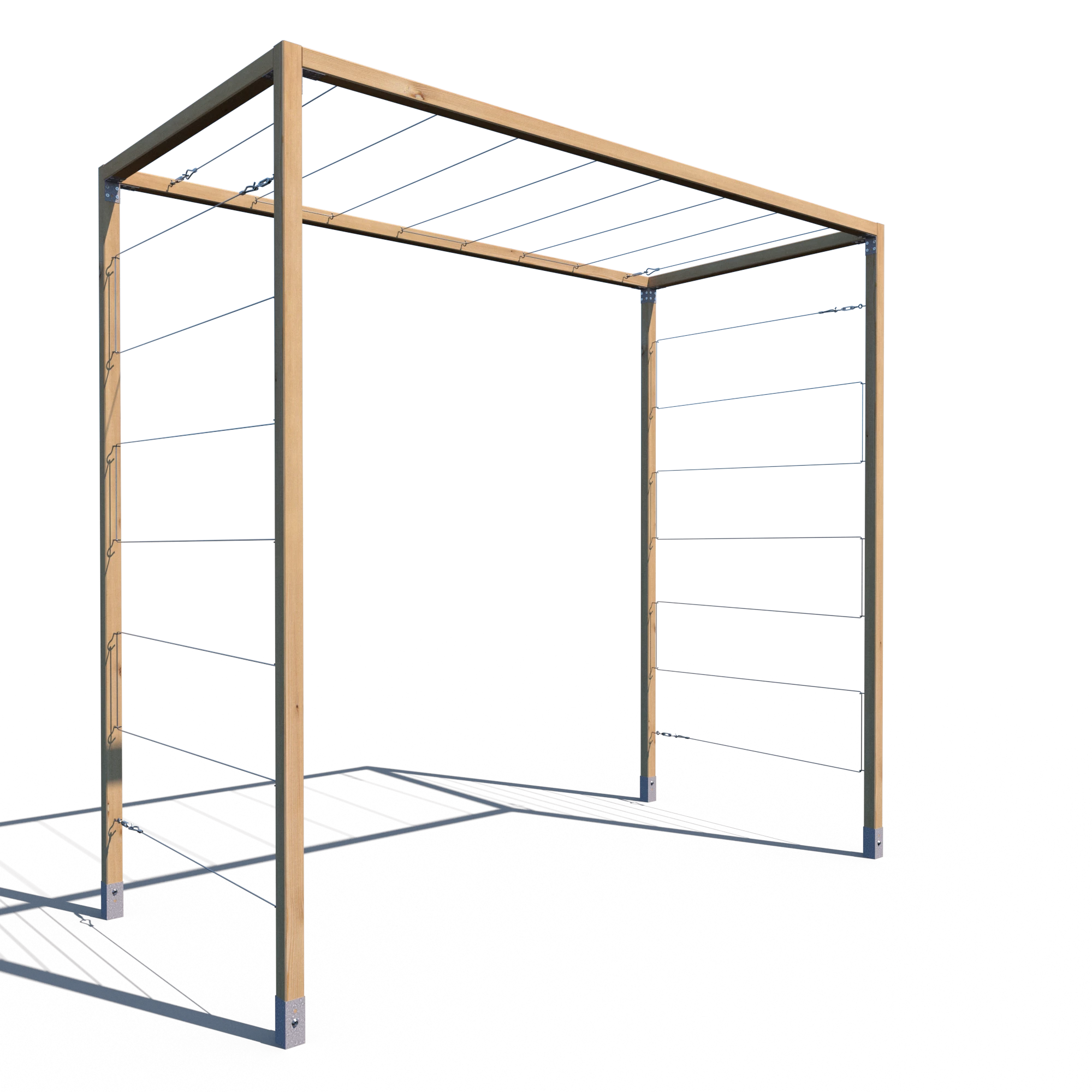 Pergola K Mini o wymiarach 210x109x219 cm została zaprojektowana z myślą o użytkownikach ceniących estetykę i funkcjonalność w kompaktowej formie. Cztery pionowe i cztery poziome kantówki tworzą lekką, ale wytrzymałą konstrukcję. Układ linek stalowych poziomy – 7 linek na bokach oraz 8 na górze – umożliwia skuteczne prowadzenie roślin pnących. Impregnacja ciśnieniowa w kolorze ciemny dąb zapewnia trwałość przez lata.