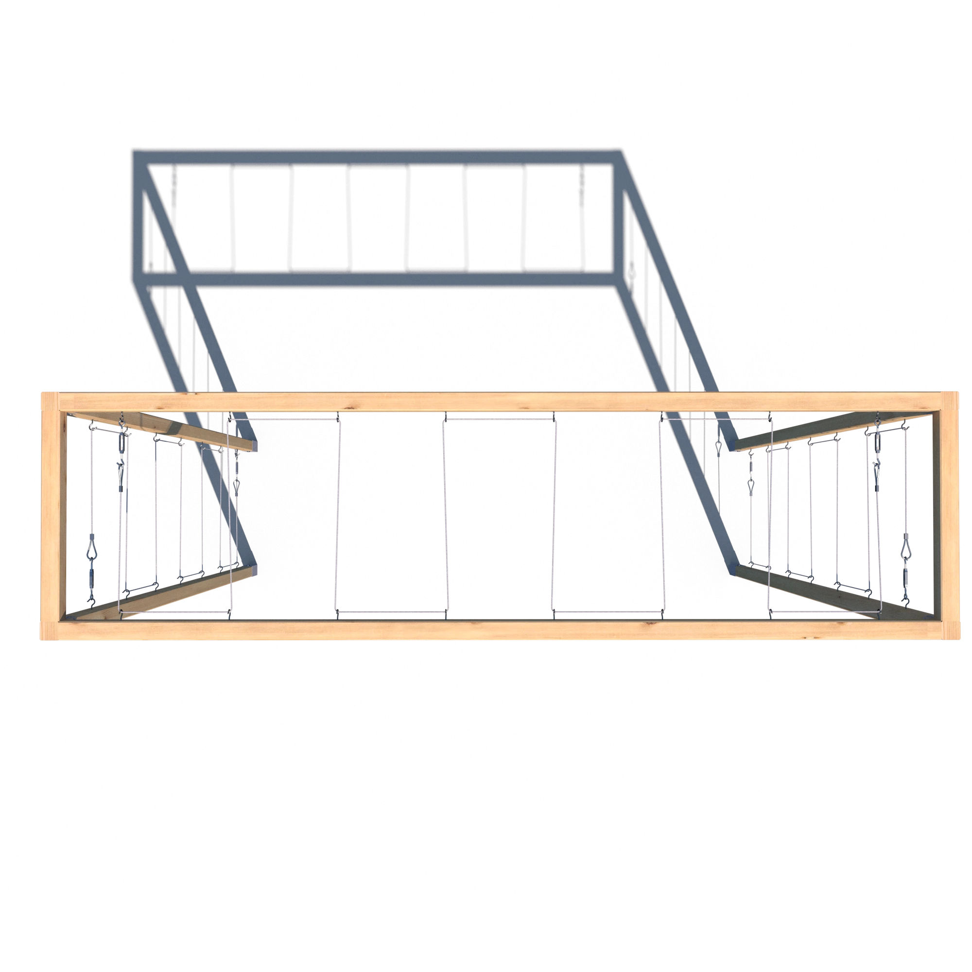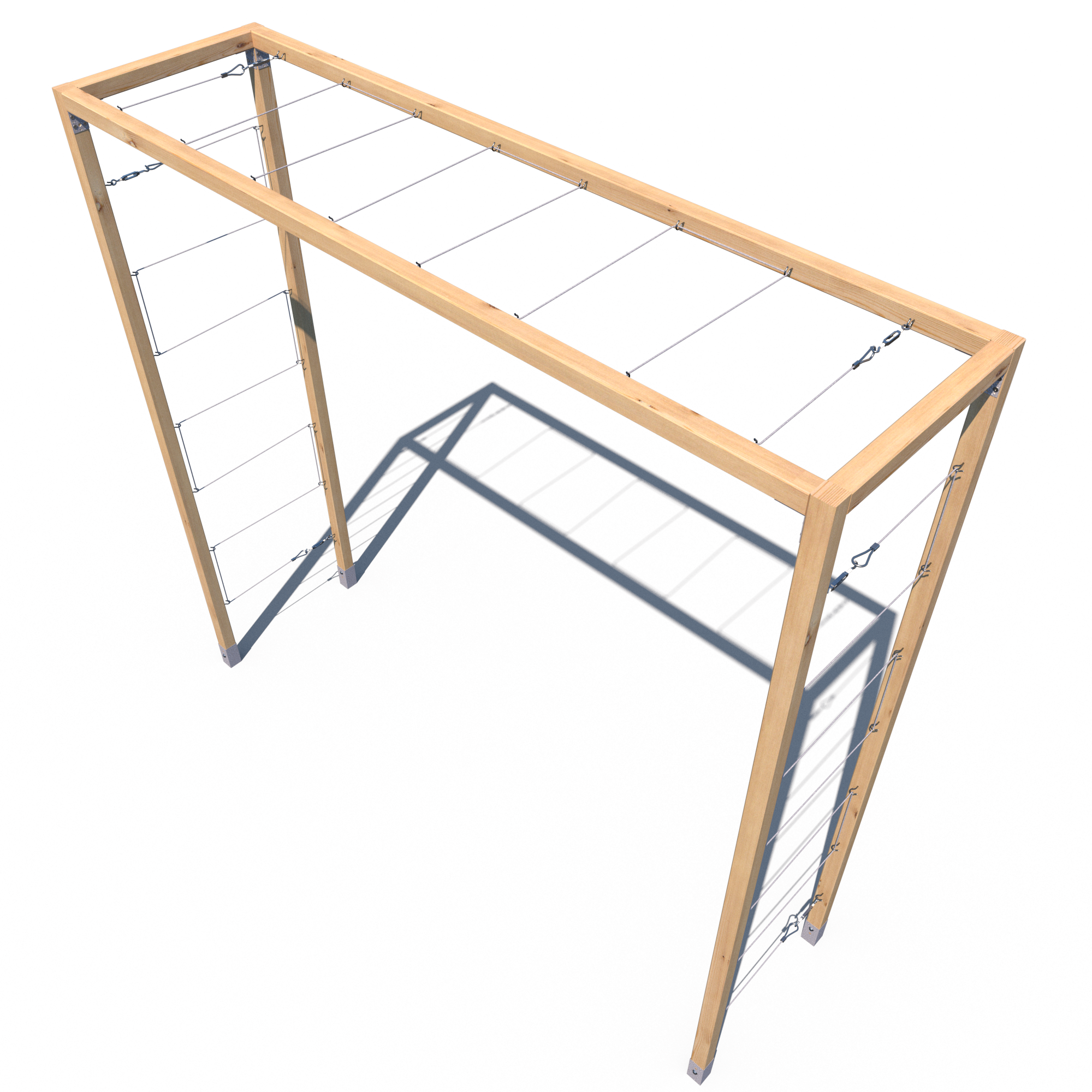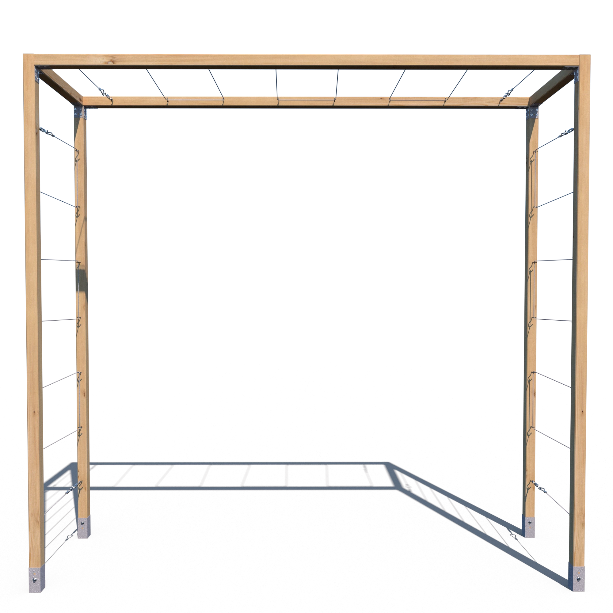 Model K Mini to mniejszy wariant pergoli serii K, który mimo kompaktowych wymiarów zachowuje solidną budowę. Cztery kantówki pionowe i cztery górne belki tworzą lekką, a zarazem trwałą ramę do prowadzenia roślin. Układ linek stalowych obejmuje dwie ściany boczne (po 7 linek) oraz górną część konstrukcji (8 linek w układzie poziomym). Świetnie nadaje się do miejsc z ograniczoną przestrzenią.
