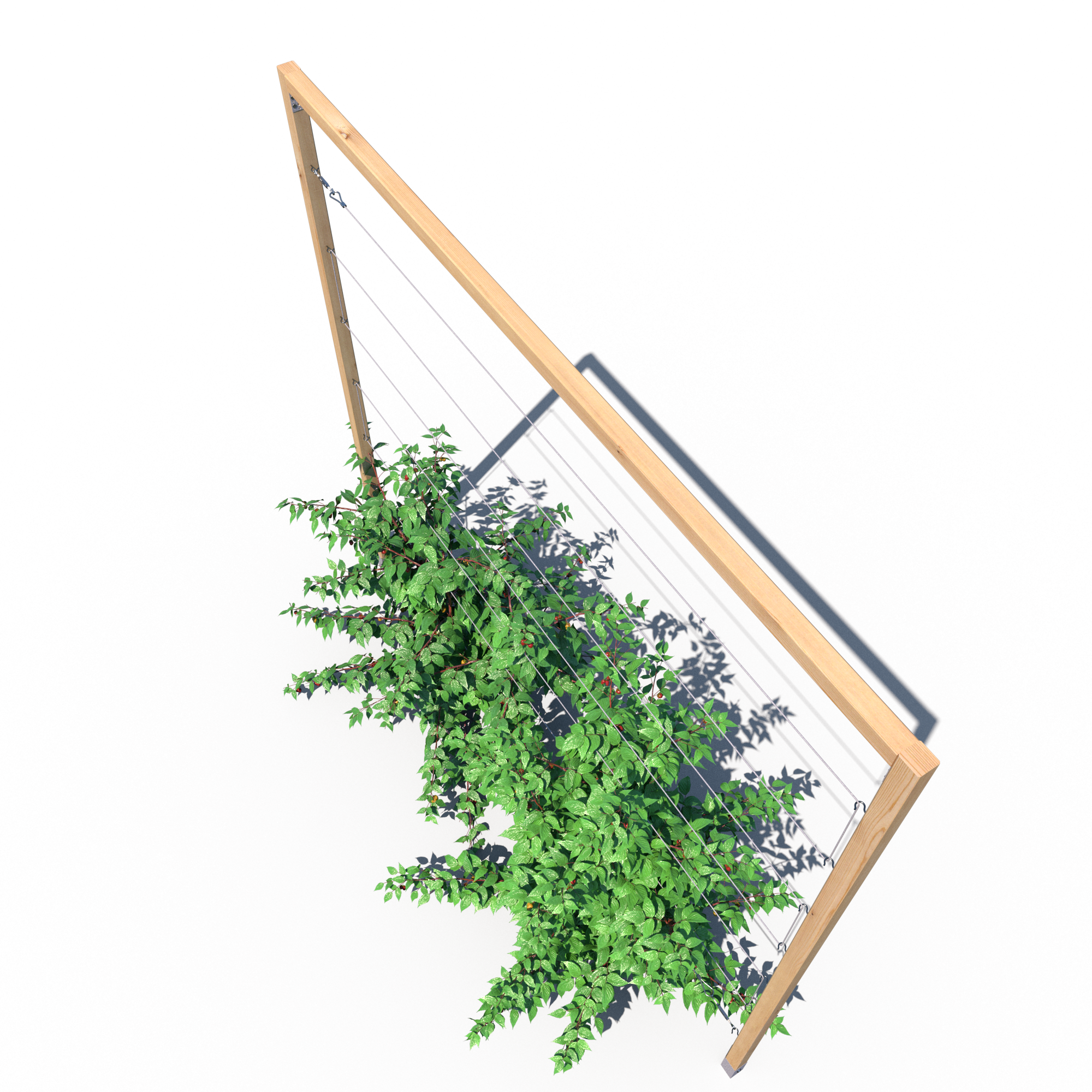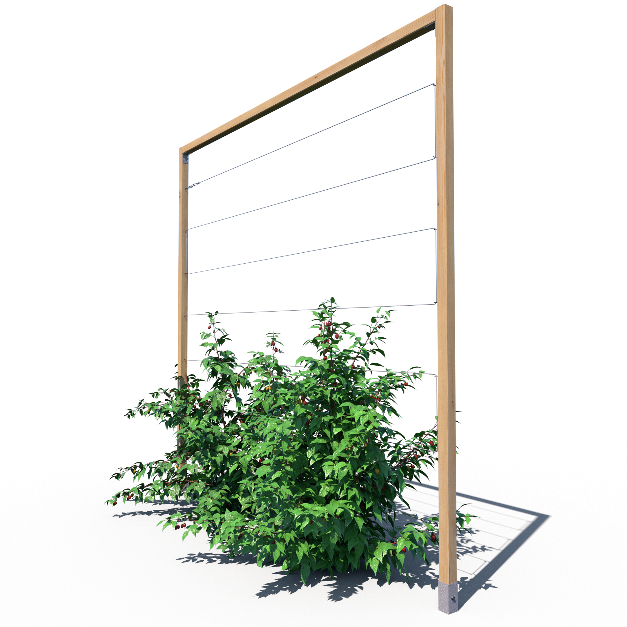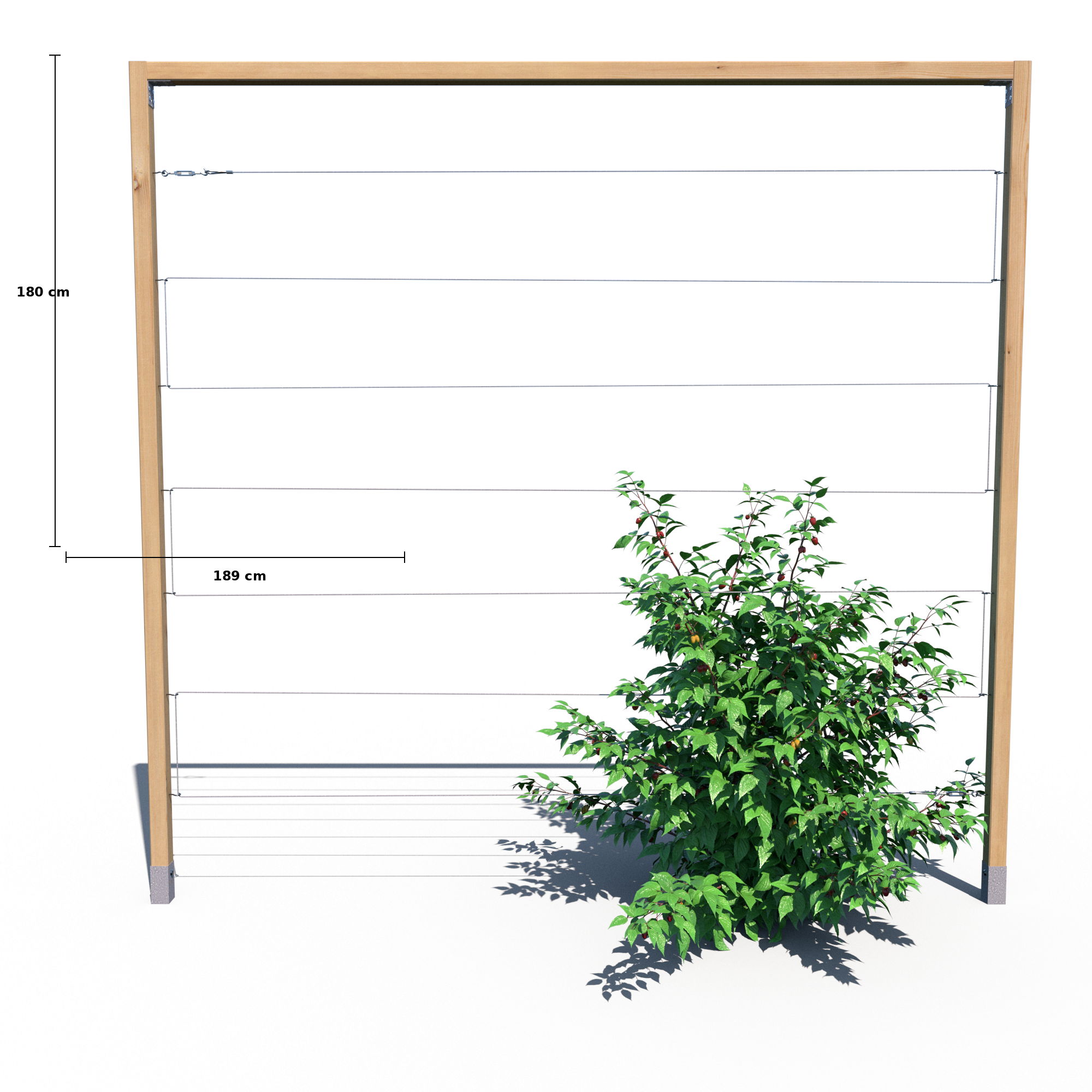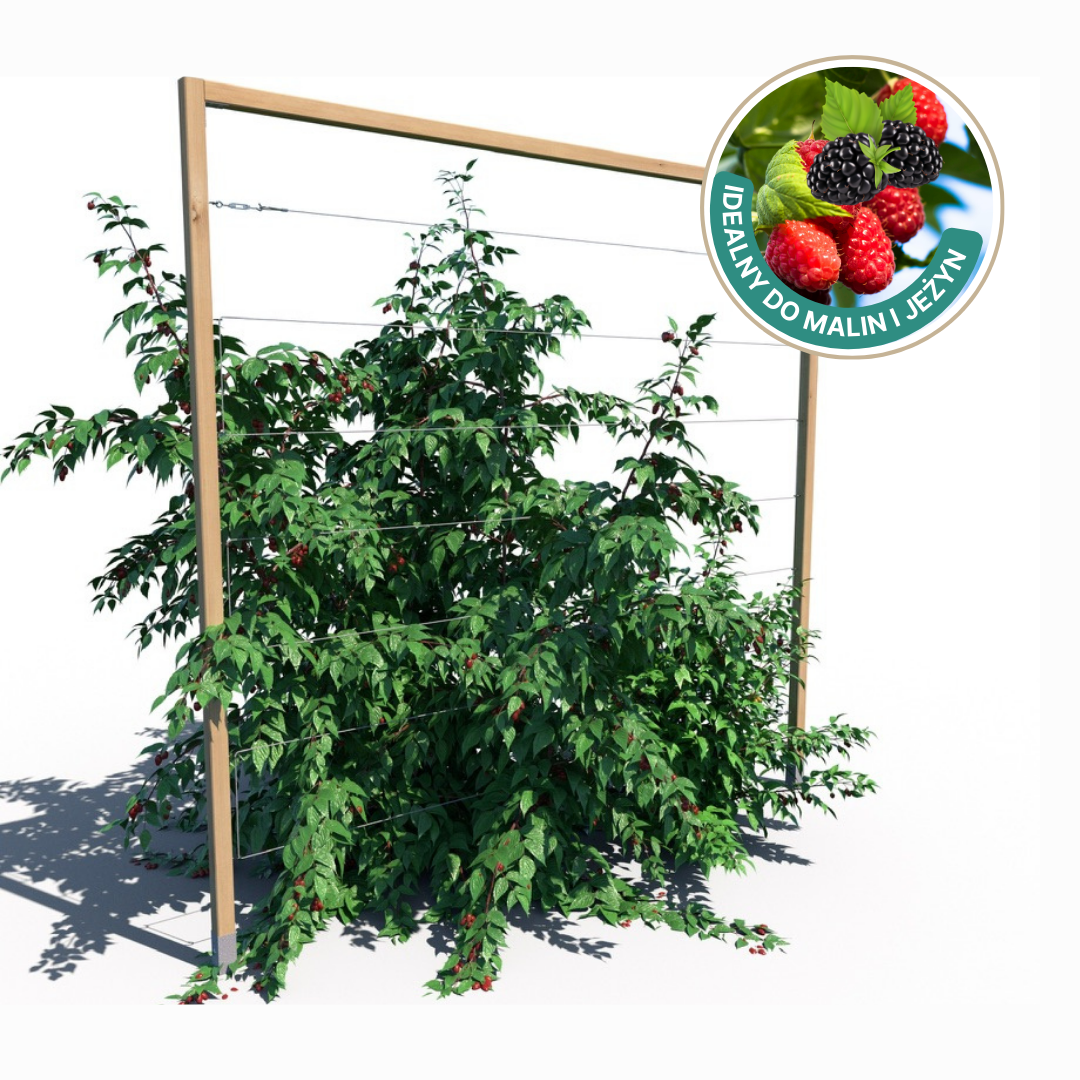 Stabilna rama z drewna sosnowego oraz poziome cięgna stalowe tworzą podporę, która porządkuje wzrost roślin i ułatwia ich prowadzenie.
