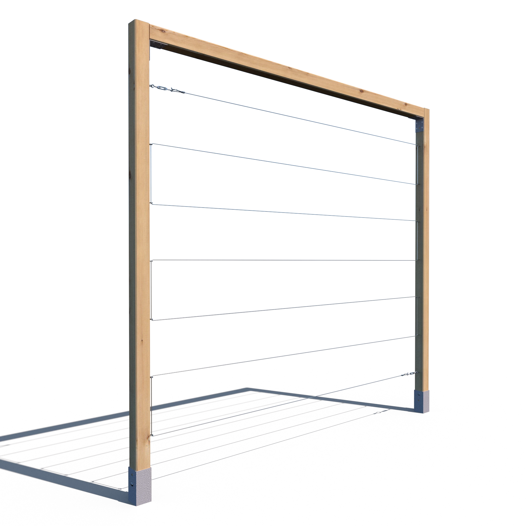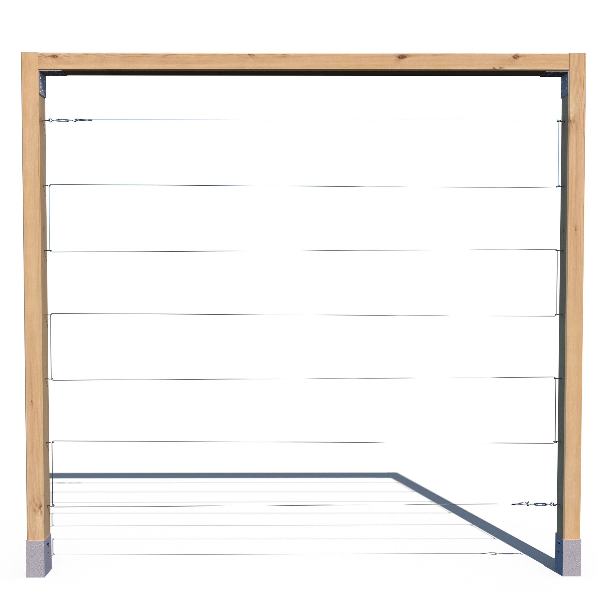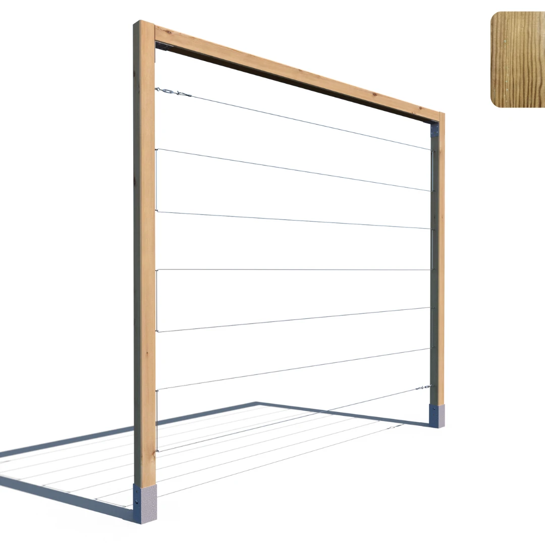 Model R 210x224 to klasyczna konstrukcja trejażu oparta na dwóch kantówkach pionowych i jednej belce górnej. Prosty, ale solidny układ wykonany z grubych kantówek (70x70 mm) doskonale sprawdzi się w ogrodzie, na działce lub przy tarasie. Układ linek – poziomy lub pionowy – pozwala dopasować produkt do rodzaju prowadzonej roślinności. Impregnacja ciśnieniowa w kolorze zielonym zapewnia trwałość przez wiele sezonów.