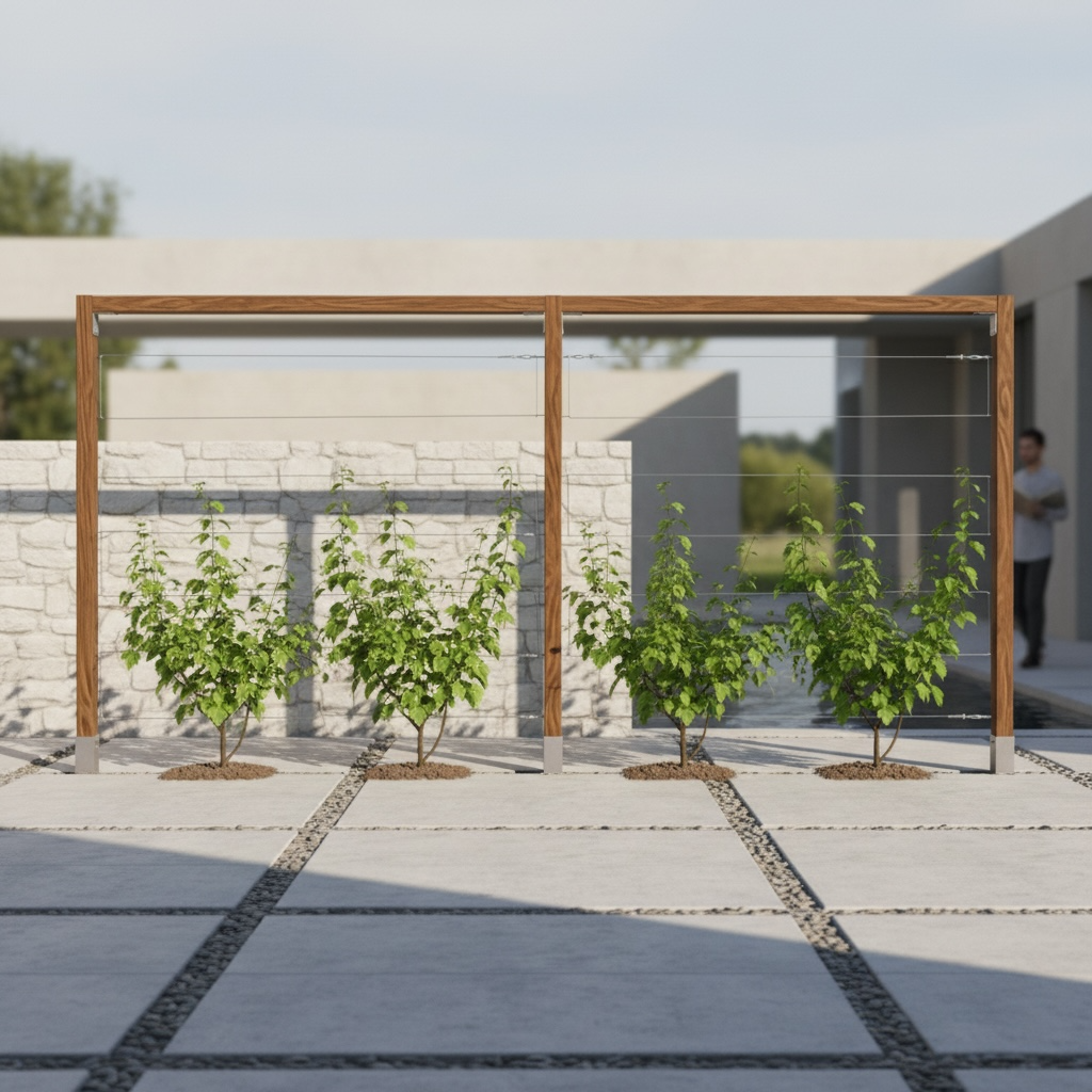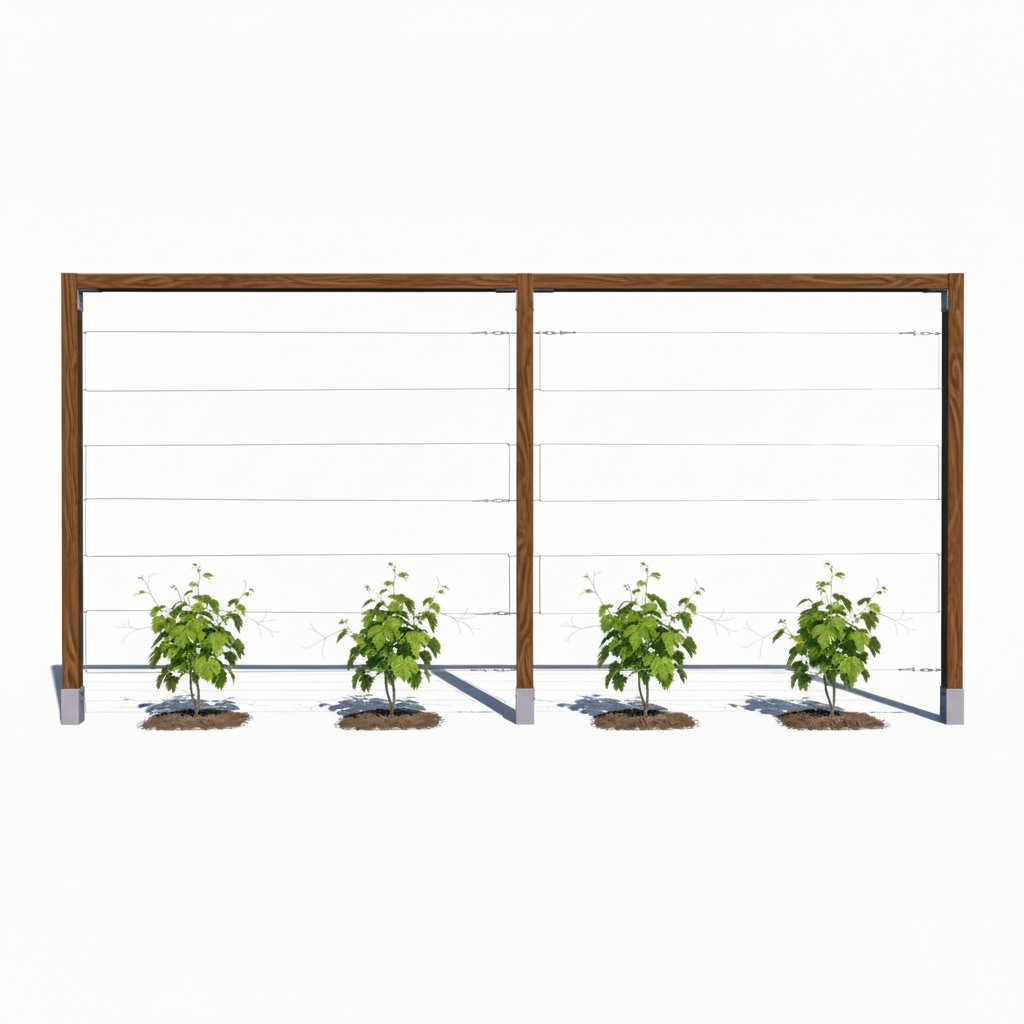 Modułowa konstrukcja drewniana z systemem stalowych cięgien, zaprojektowana do kontrolowanego prowadzenia roślin w przestrzeni. Dedykowana dla winorośli oraz gatunków wymagających uporządkowanego wzrostu.