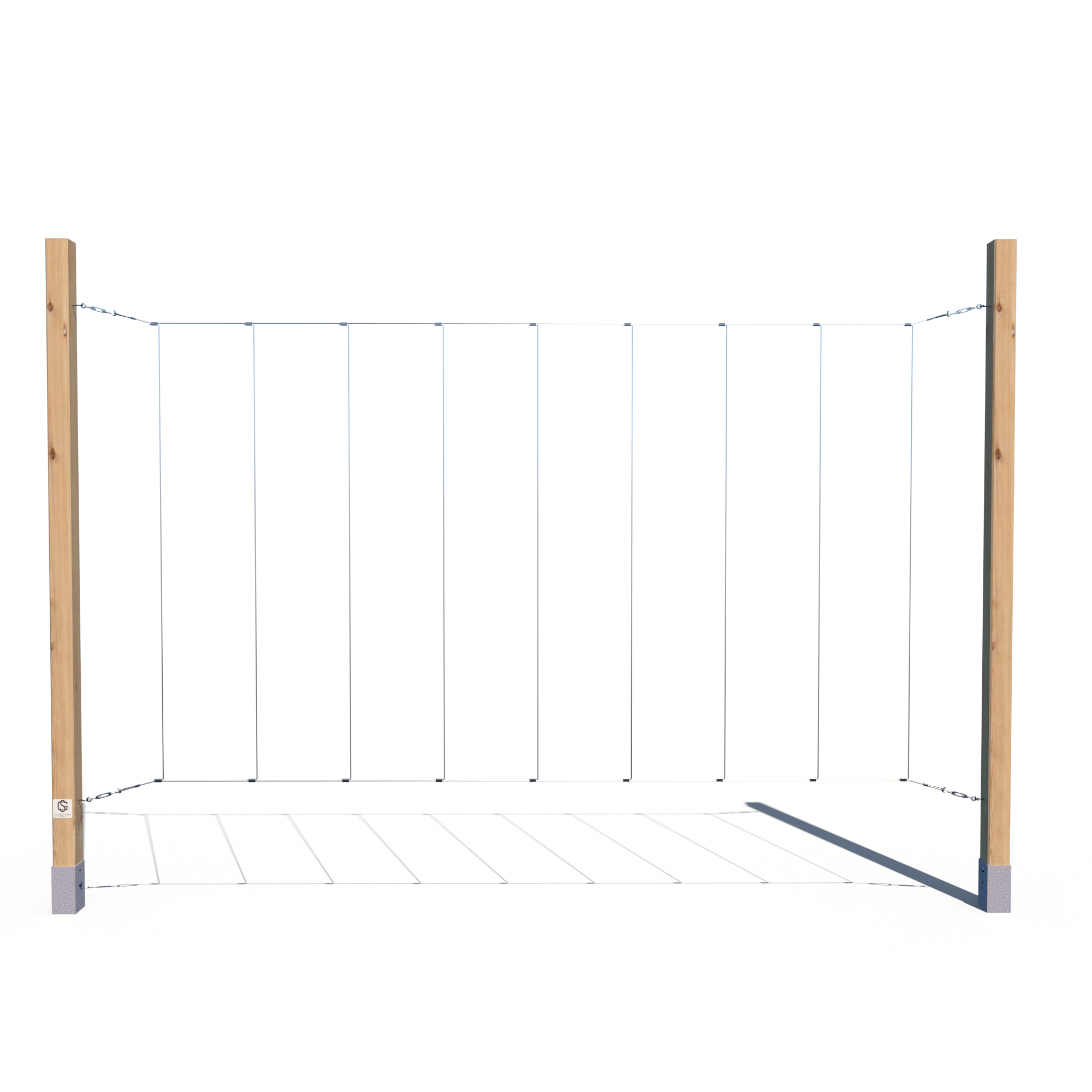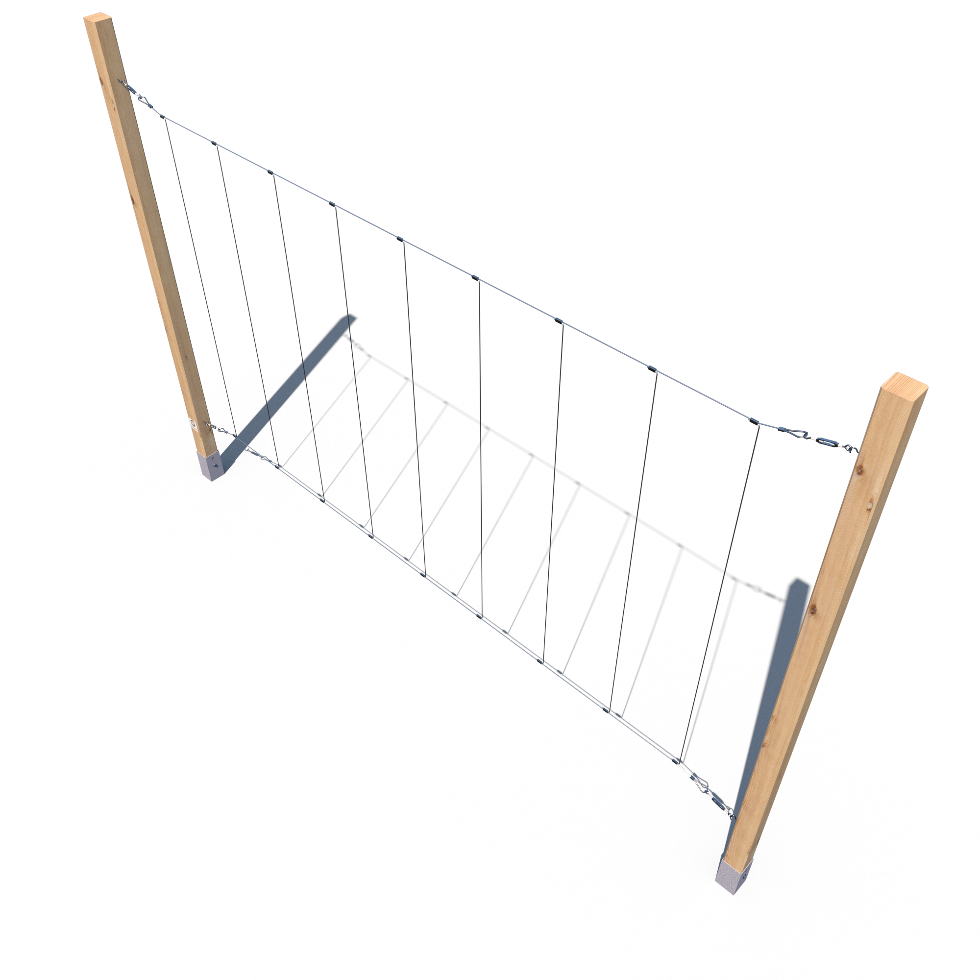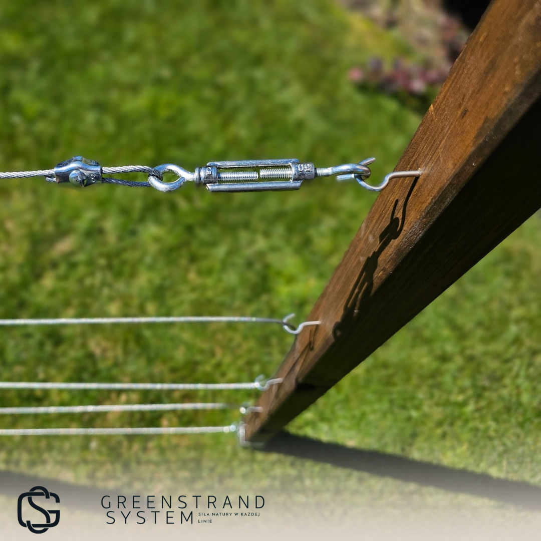 Wytrzymały trejaż o szerokości 300 cm i wysokości 210 cm wykonany z kantówki 70x70 mm. Impregnowany ciśnieniowo na zielono, umożliwia prowadzenie roślin w pionie lub poziomie dzięki elastycznemu układowi lin stalowych.
