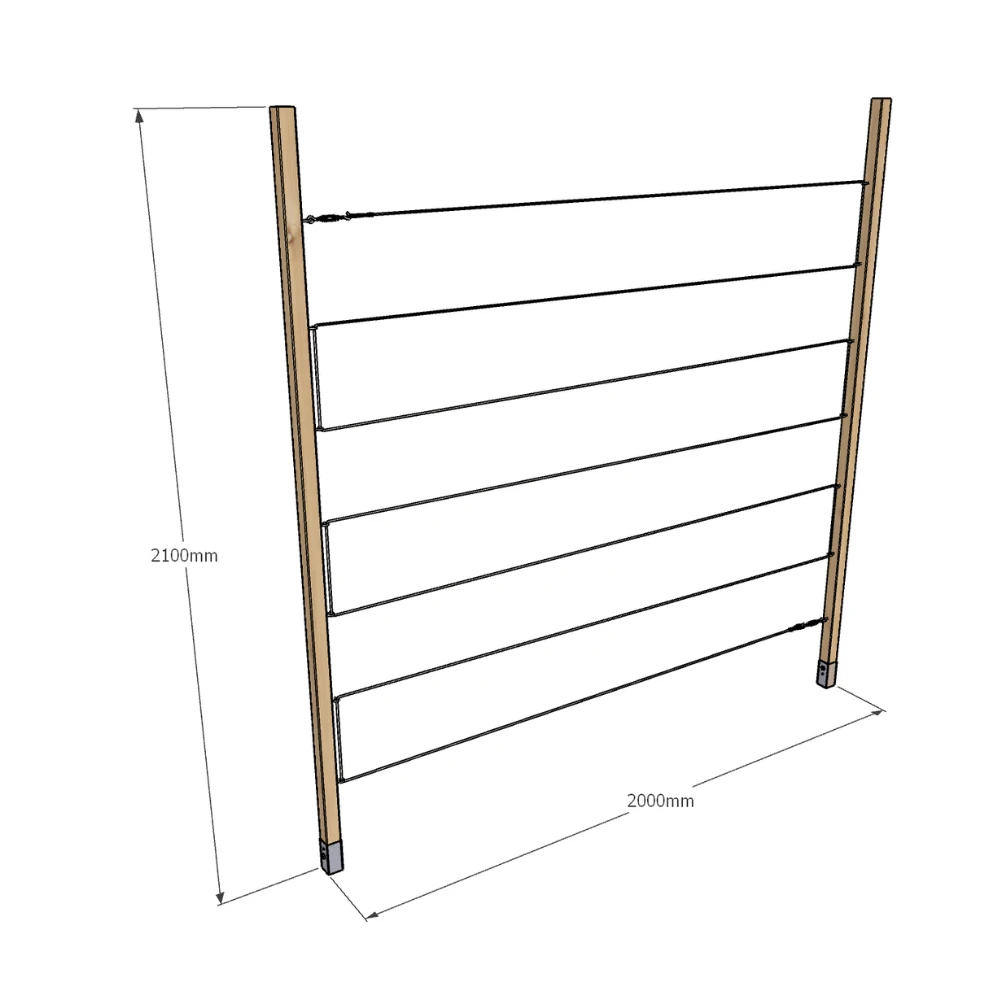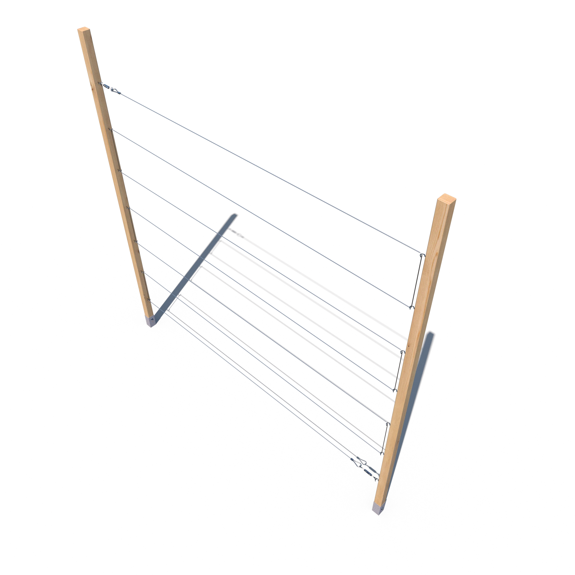 Mały trejaż ogrodowy do roślin pnących, wykonany z kantówki 45x45 mm i impregnowany ciśnieniowo na kolor ciemny dąb. Idealny na balkon, taras lub wąskie przestrzenie ogrodowe. Układ linek stalowych: poziomy (standard) lub pionowy.