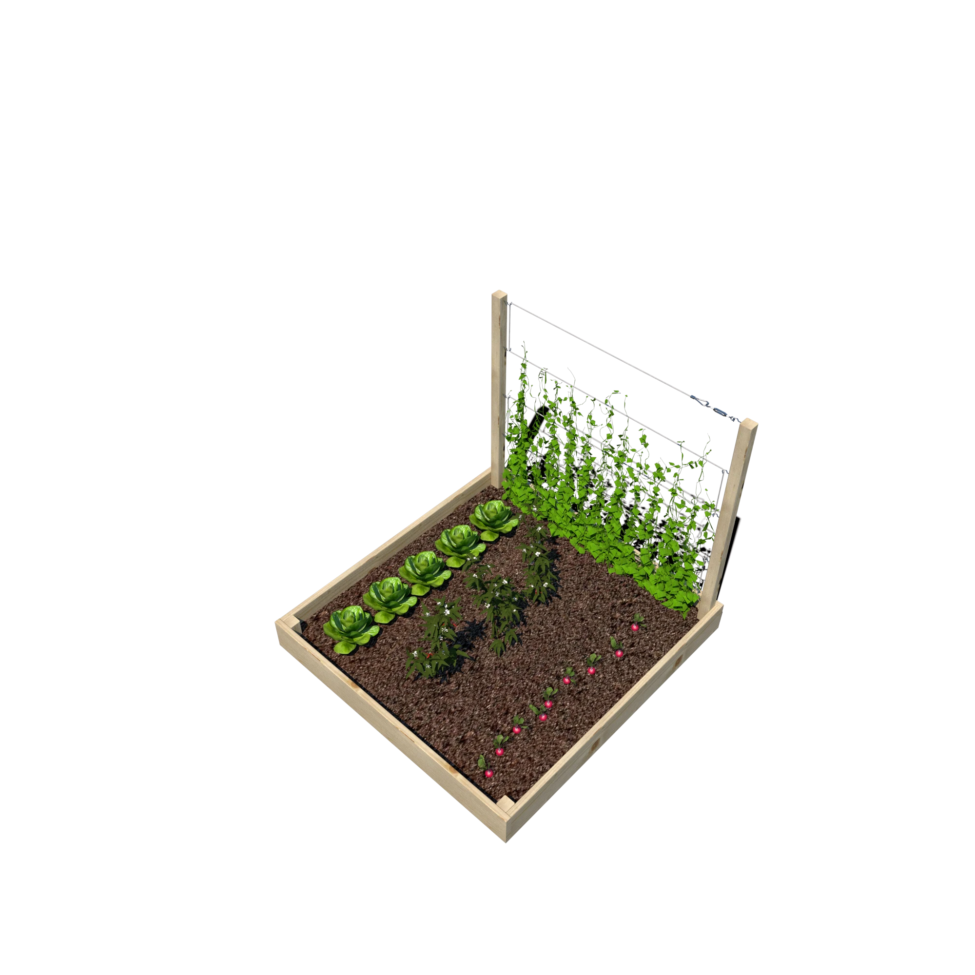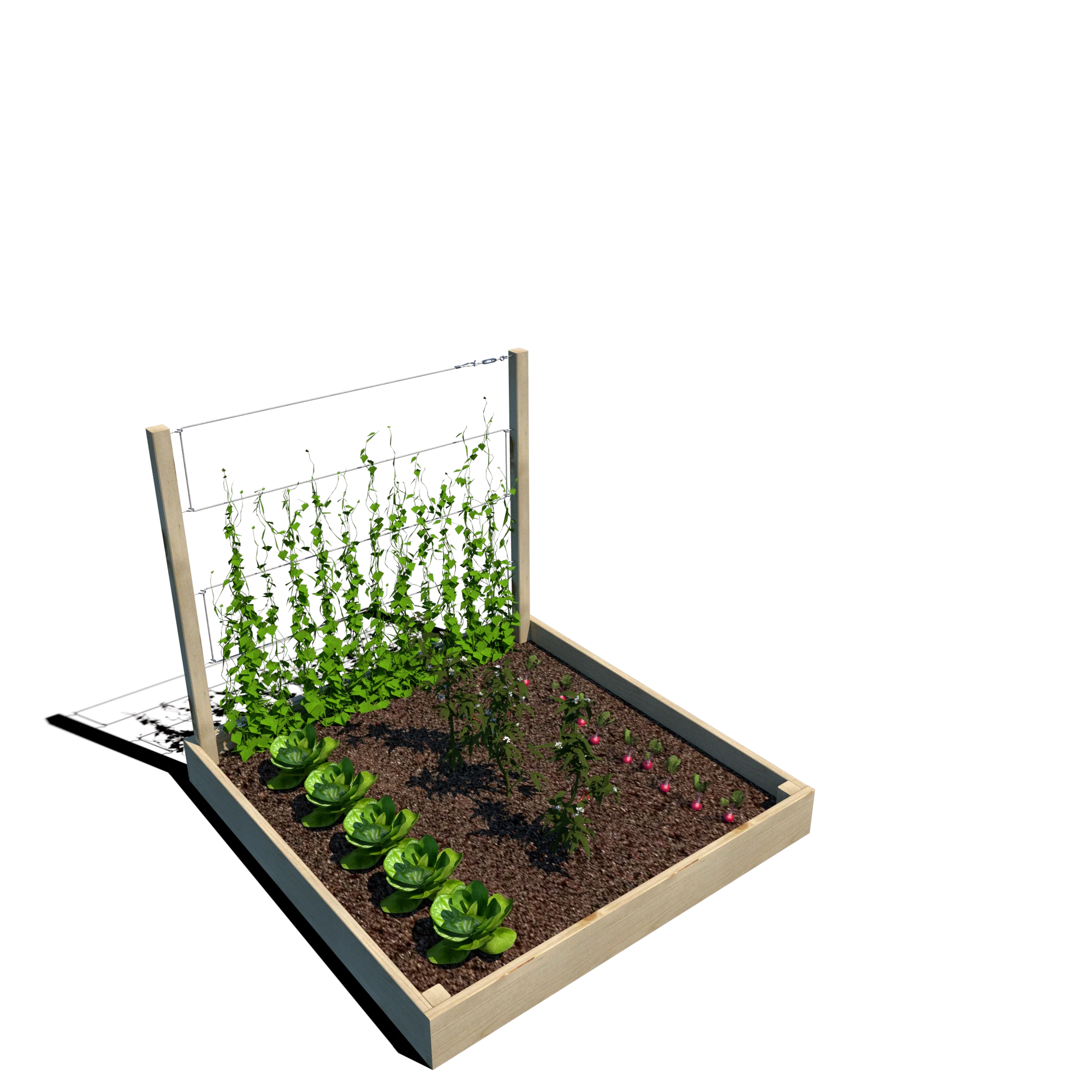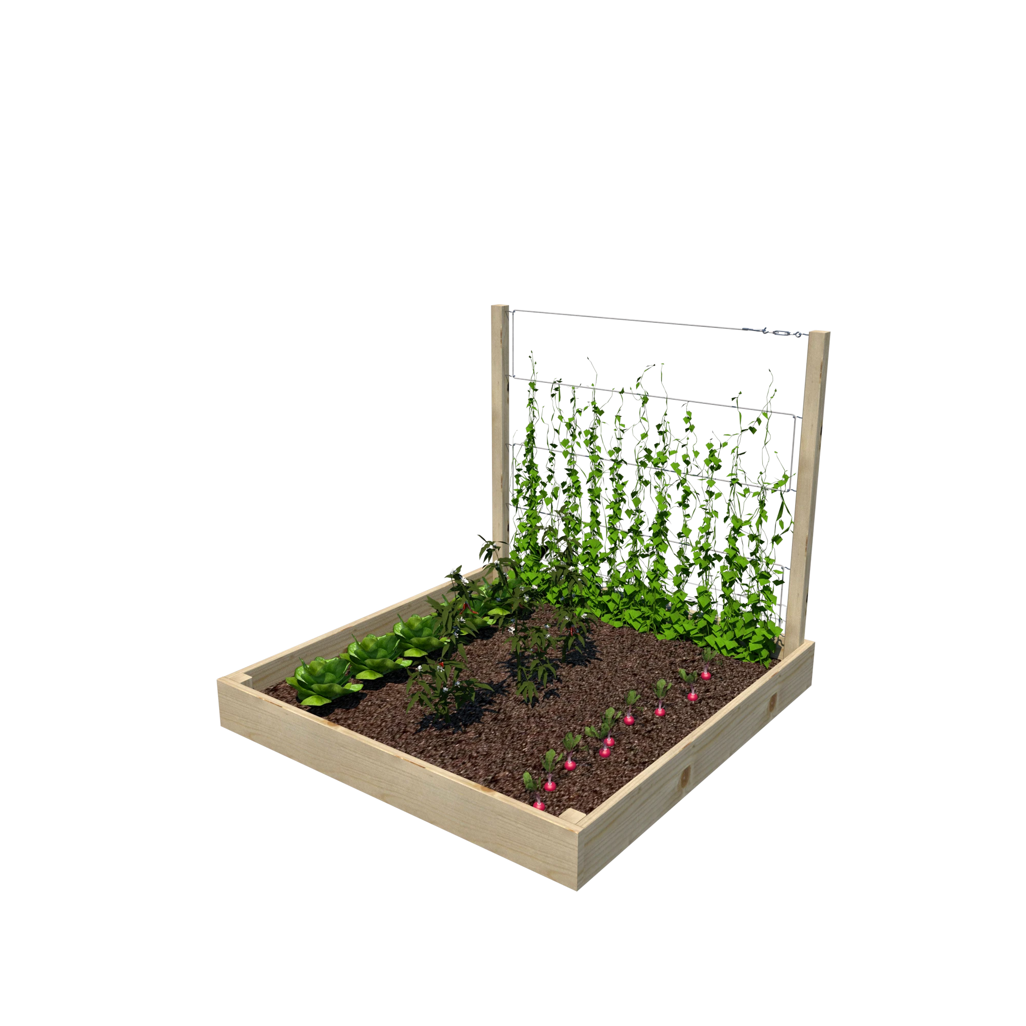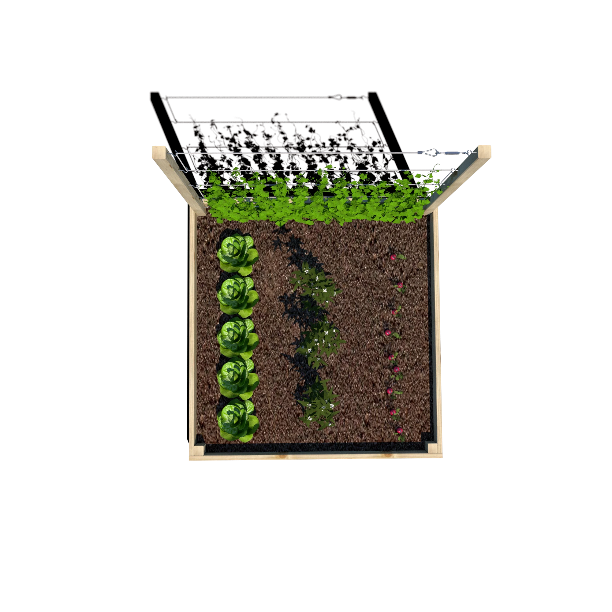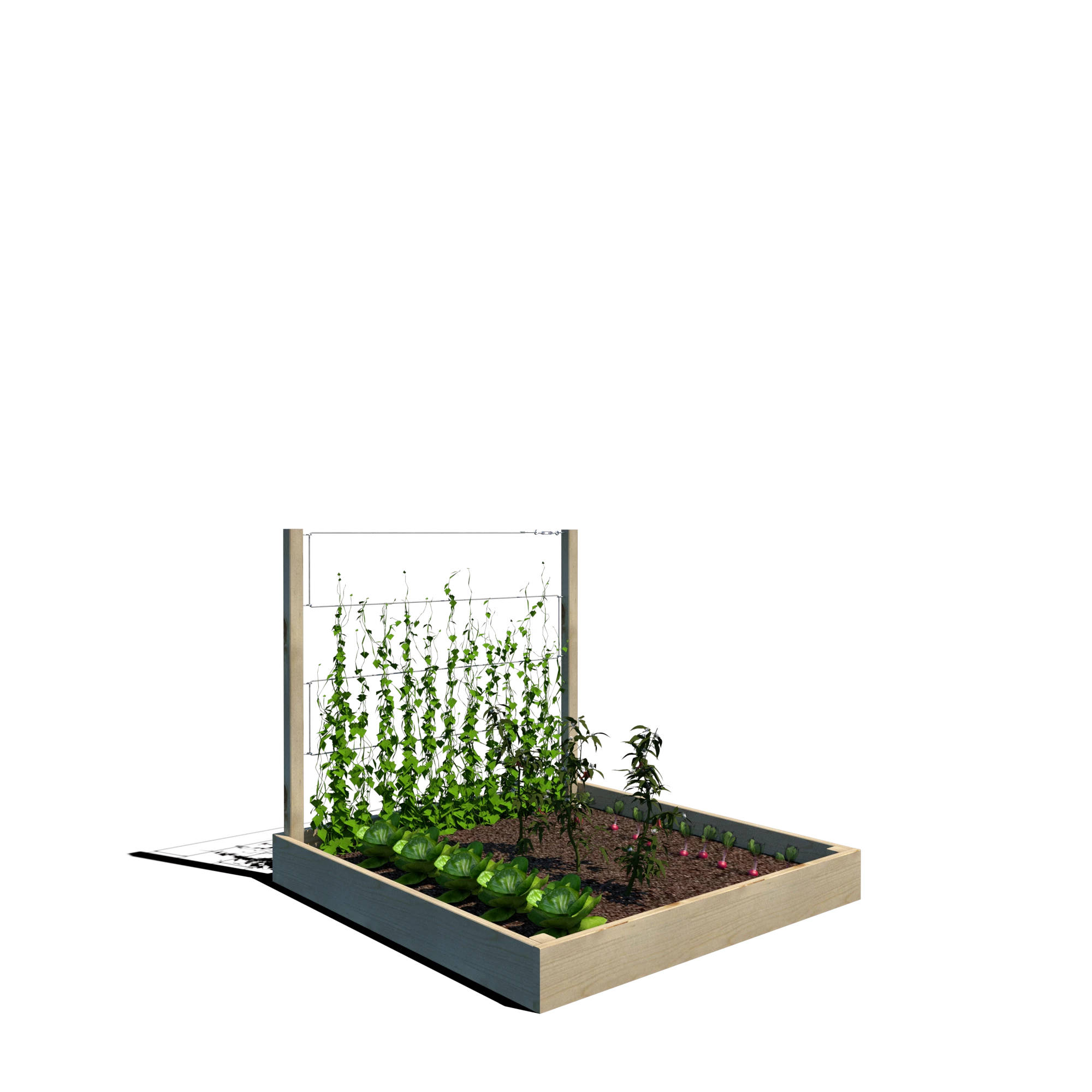 Warzywnik zapewnia optymalne warunki do uprawy warzyw, ziół i kwiatów, a wbudowany trejaż o wysokości 105 cm jest doskonałym wsparciem dla roślin pnących, takich jak fasola, groch, pomidory czy winorośl. Dzięki przemyślanej konstrukcji można go umieścić w dowolnym miejscu – w ogrodzie, na tarasie czy balkonie.