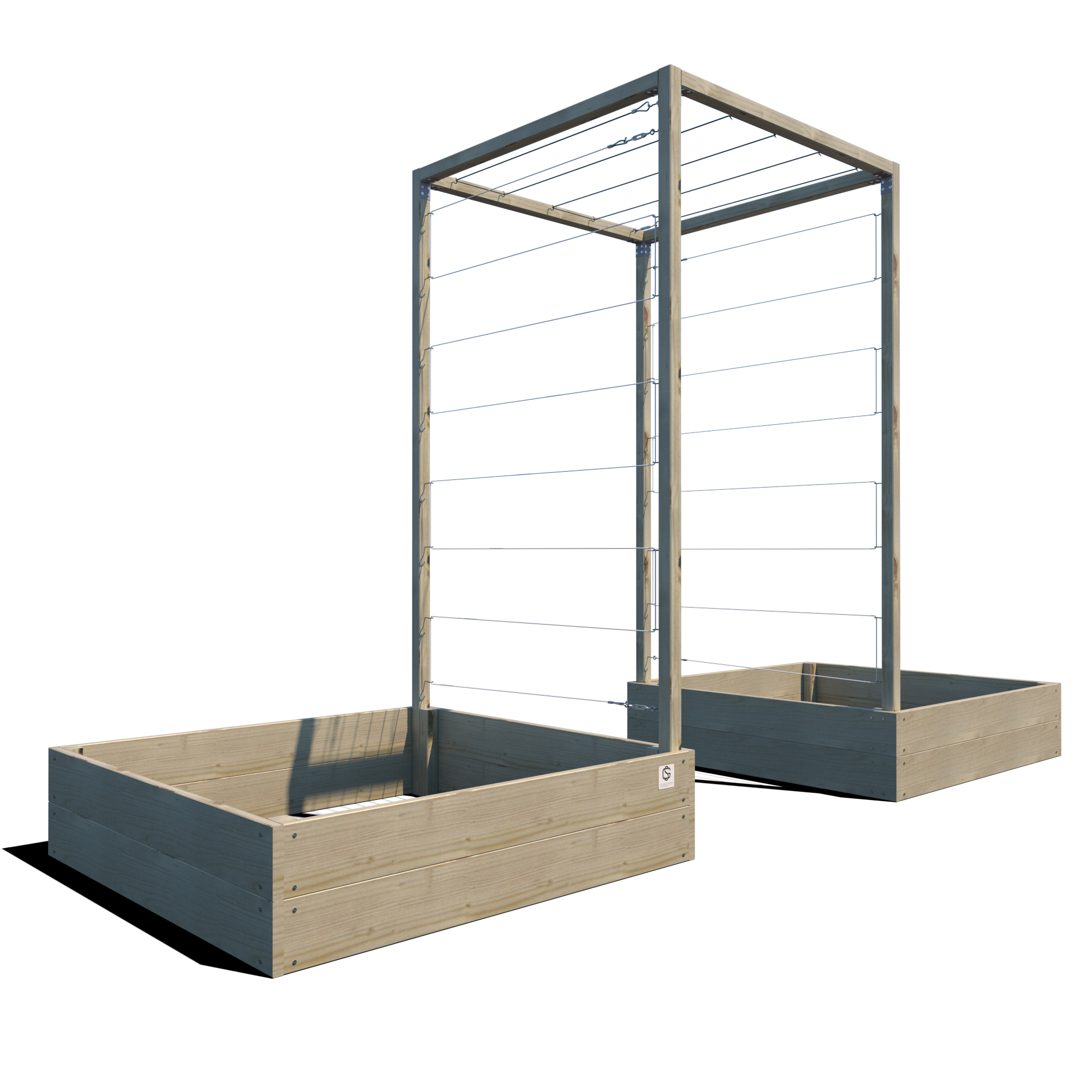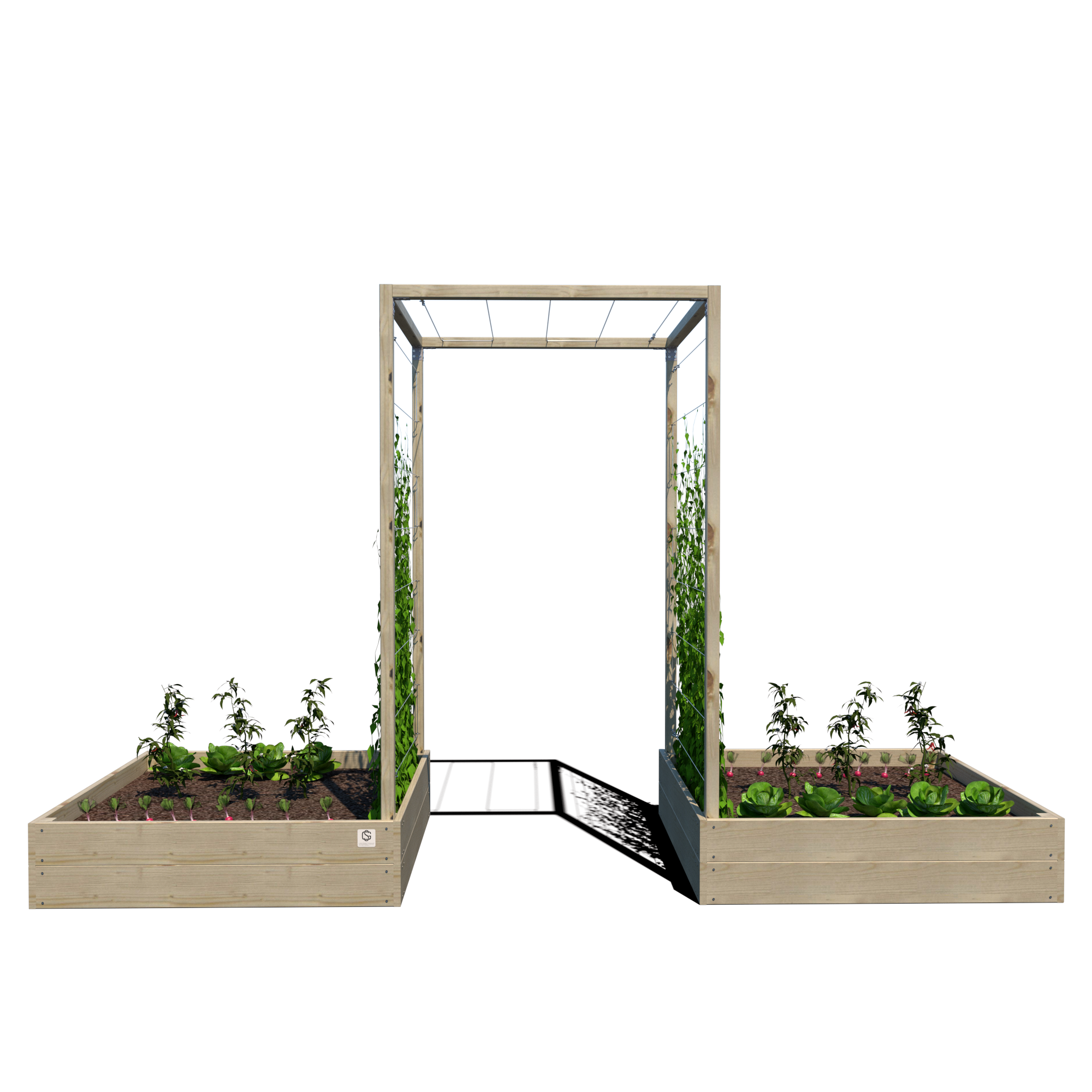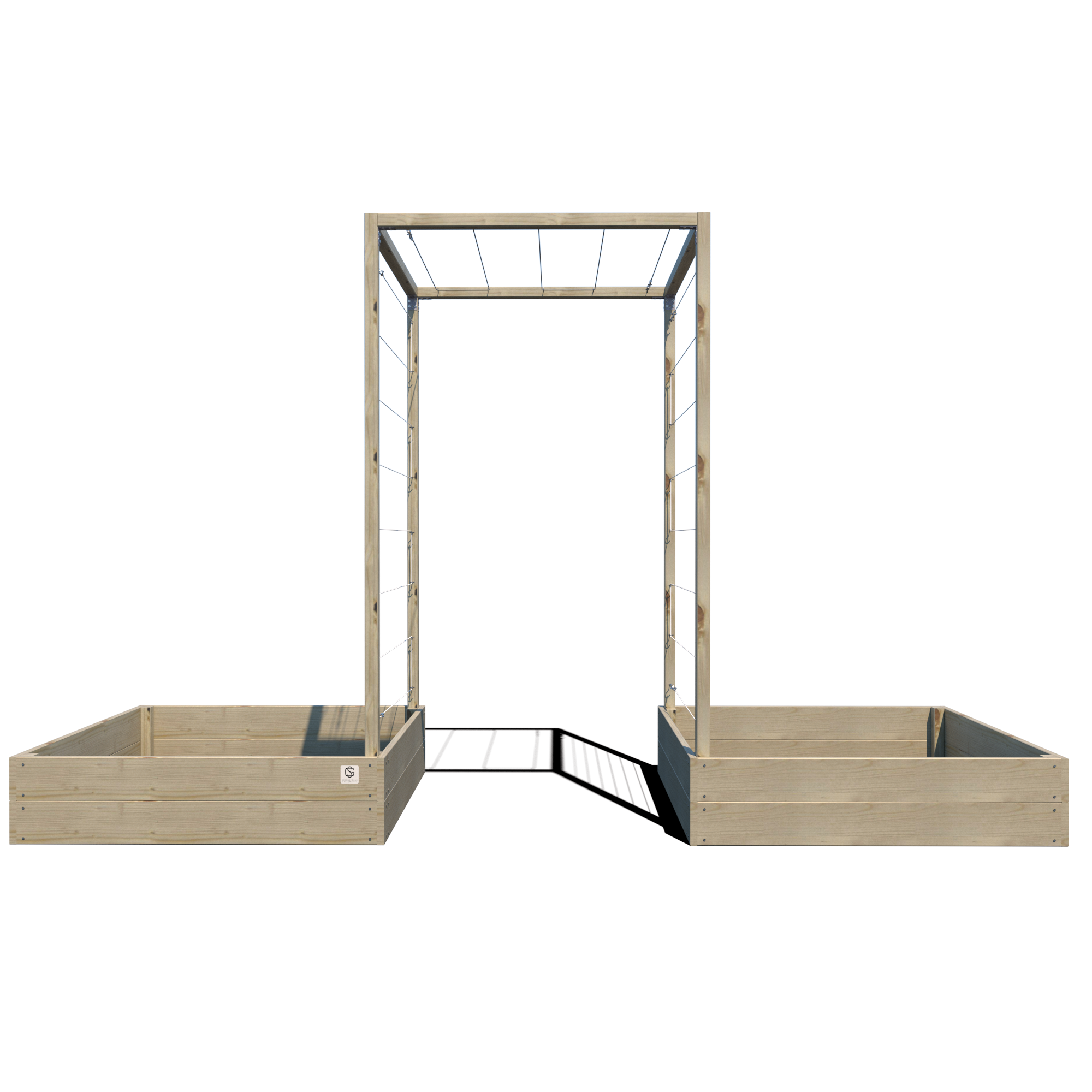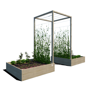 Unikalne połączenie dwóch warzywników z trejażem – efektowna i funkcjonalna forma mini pergoli do uprawy roślin pnących.