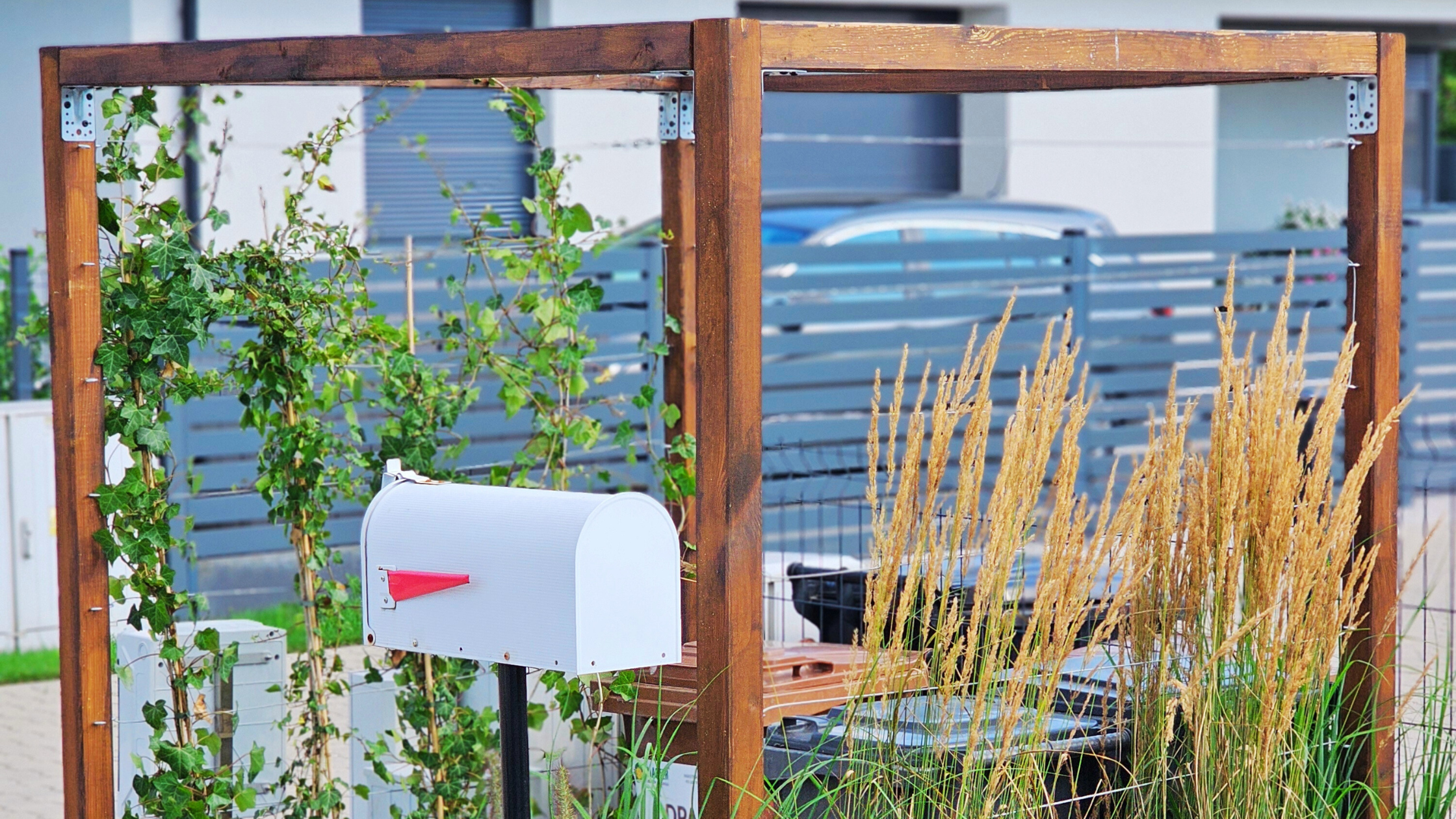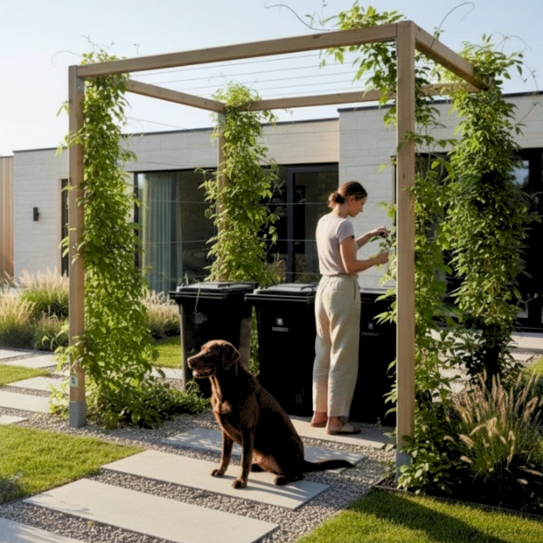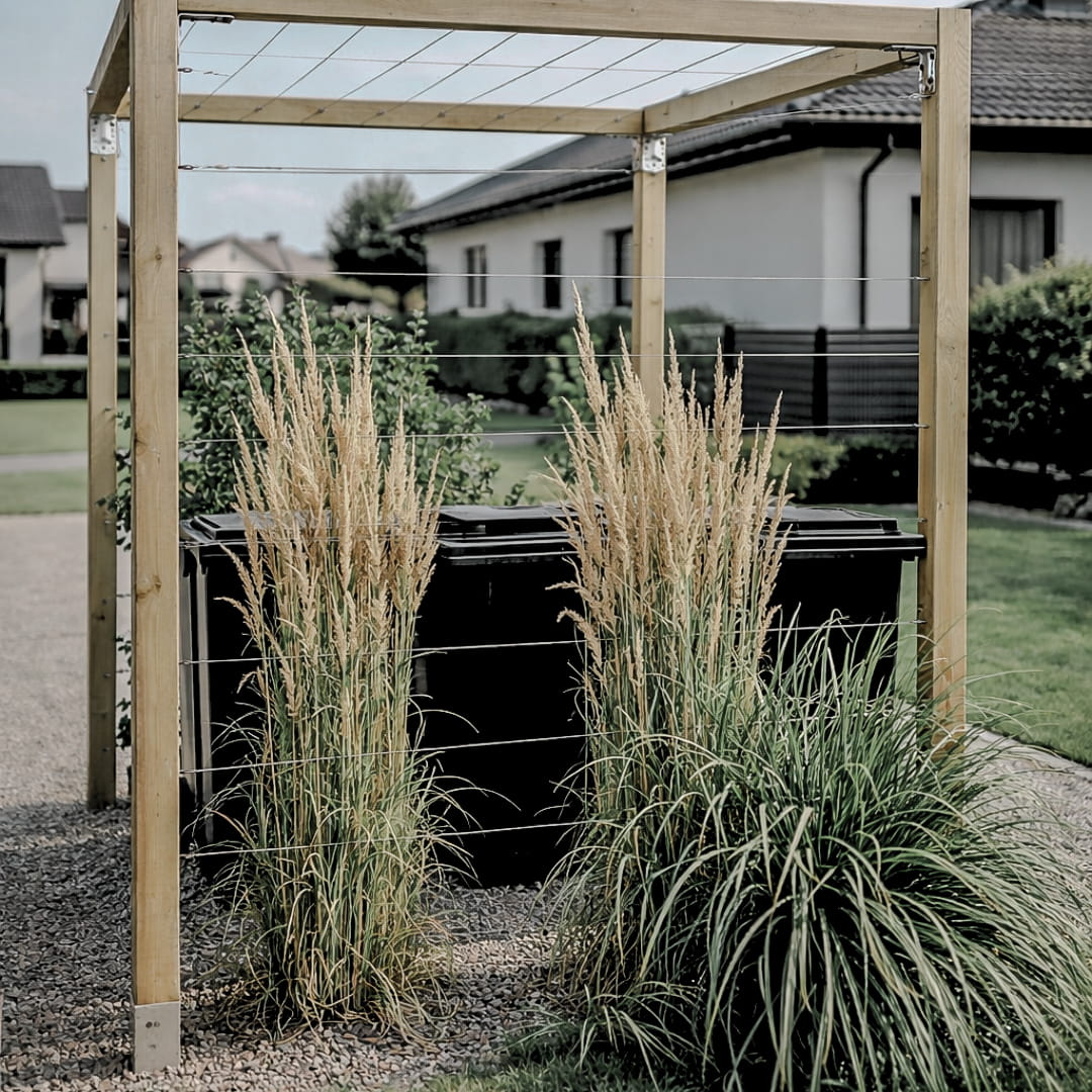 Pergola osłaniająca kosze na śmieci to idealne rozwiązanie dla osób ceniących porządek i estetykę w ogrodzie. Dzięki połączeniu drewna i stalowych linek, konstrukcja zapewnia trwałość i nowoczesny wygląd, a dodatkowo pozwala na prowadzenie roślin pnących, które tworzą zieloną ścianę i harmonijnie komponują się z przestrzenią.