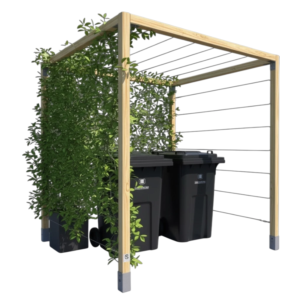 Pergola osłonowa K 2.1 to funkcjonalne i estetyczne rozwiązanie do ukrycia pojemników na odpady. Konstrukcja wykonana jest z impregnowanego drewna oraz ocynkowanych linek stalowych, co zapewnia trwałość i odporność na warunki atmosferyczne. Modułowy system pozwala na rozbudowę oraz dopasowanie do przestrzeni.
