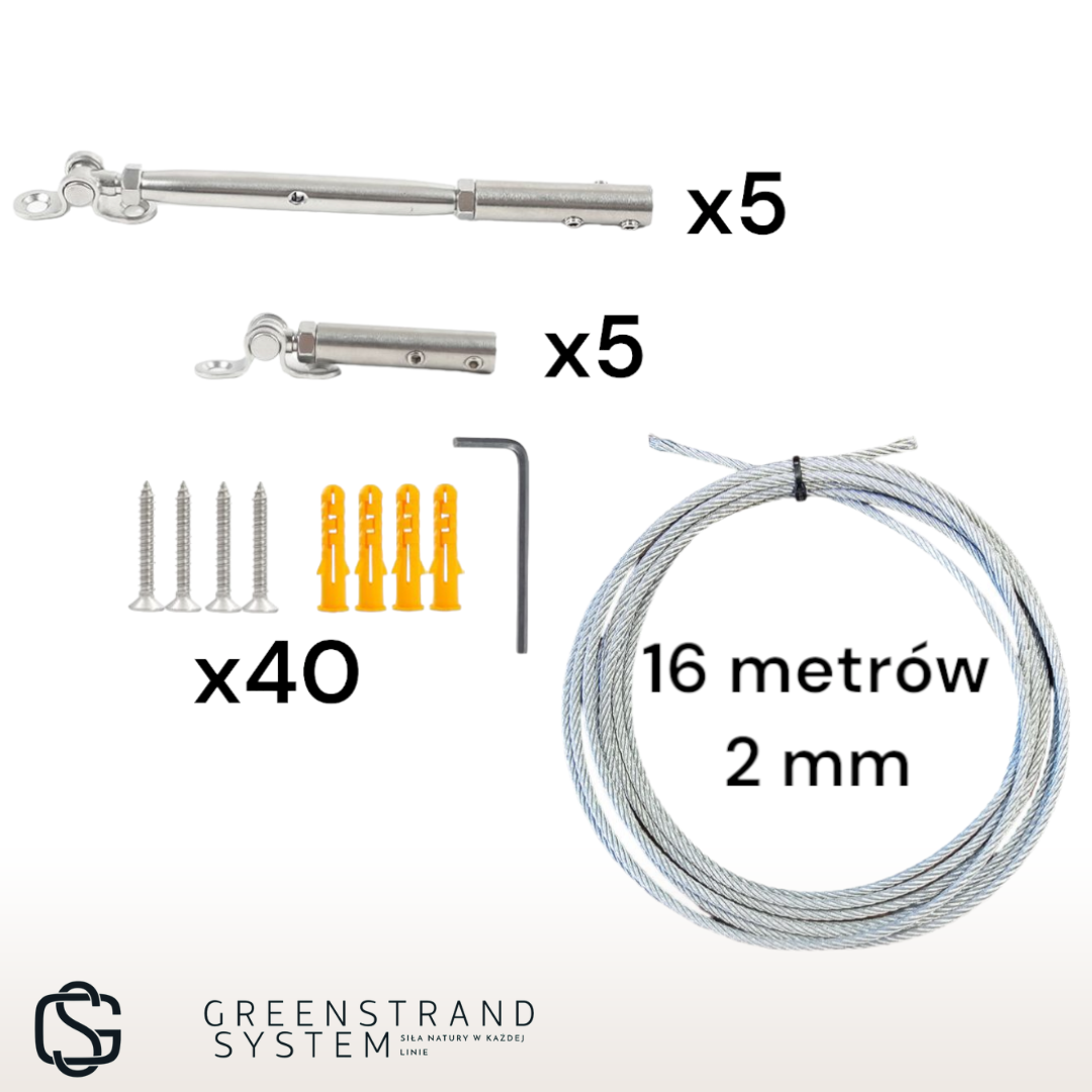 - Zestaw zawiera: 5 kompletów uchwytów linowych wahadłowych z śrubą rzymską, 16 m liny nierdzewnej 2 mm