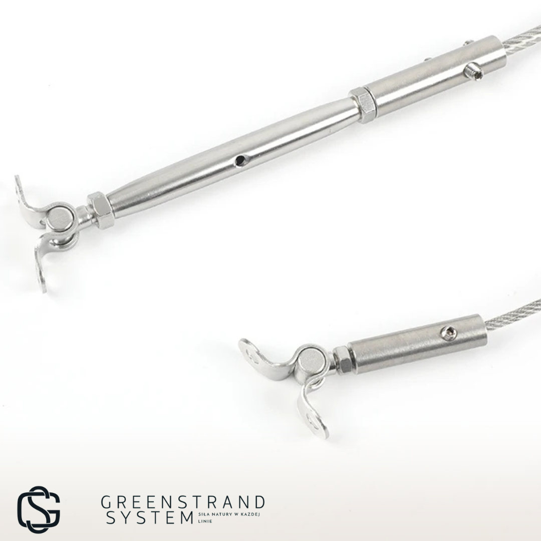 - Estetyka: Uchwyt linowy wahadłowy z śrubą rzymską umożliwia łatwe naprężenie liny i tworzenie różnych układów, co pozwala na personalizację zielonej ściany.