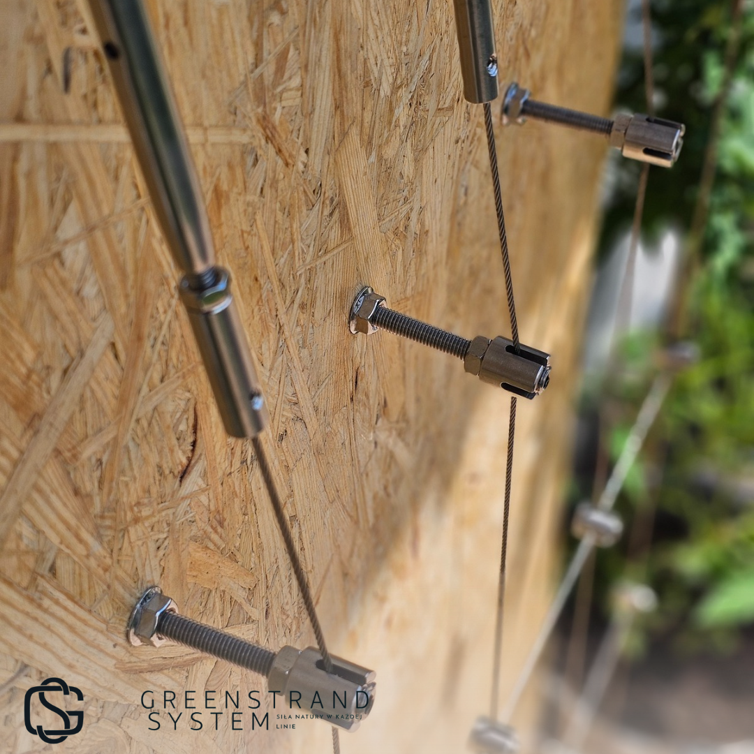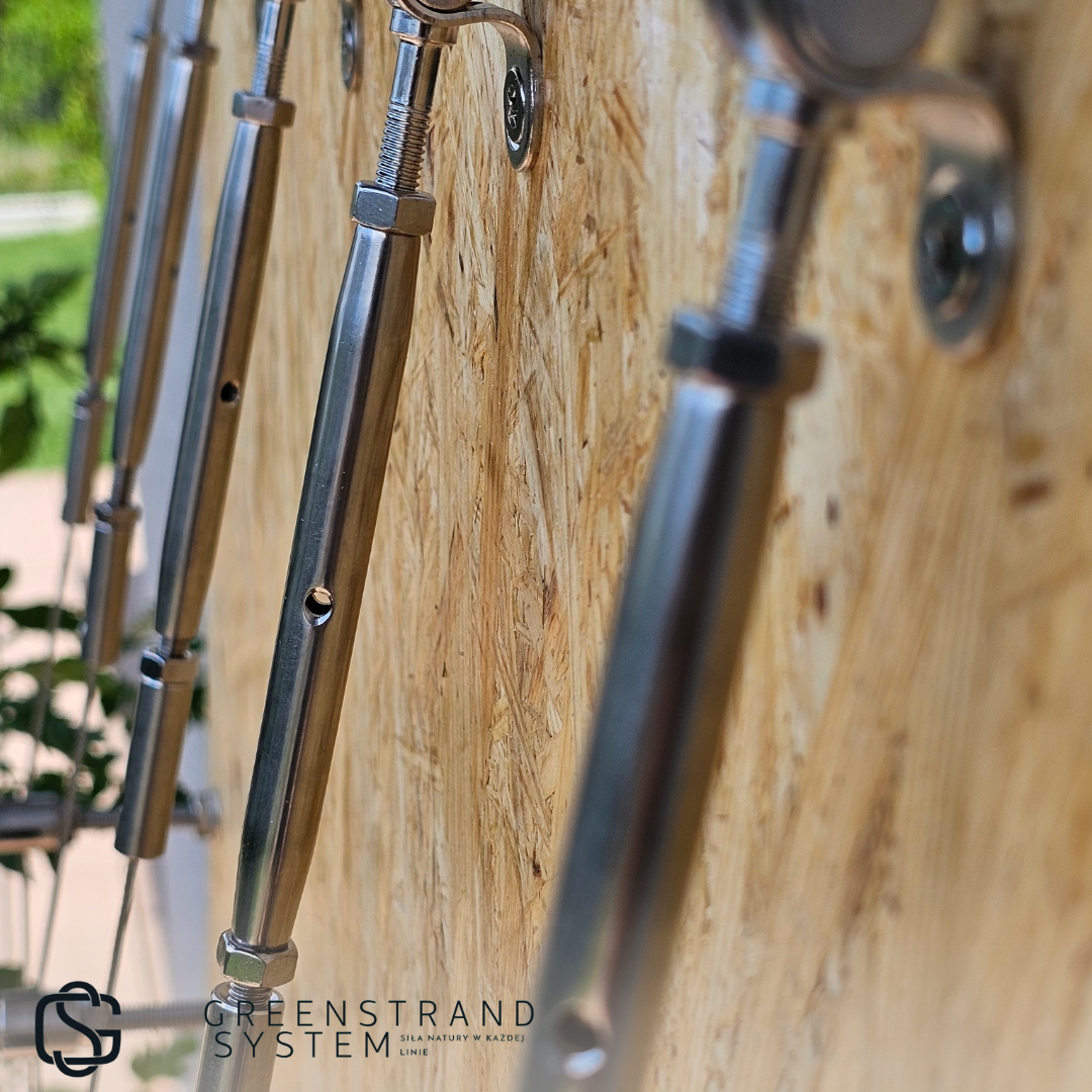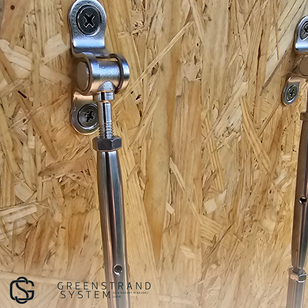 - Estetyka: Uchwyt linowy wahadłowy z śrubą rzymską umożliwia łatwe naprężenie liny i tworzenie różnych układów, co pozwala na personalizację zielonej ściany.